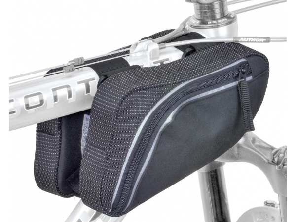 Dvojitá brašna na přední část rámu, univerzální uchycení pro většinu typů rámů, 2 samostatné polstrované kapsy (2x 0,6l). Rozměr jedné brašny d.23 š.4 v.12cm.