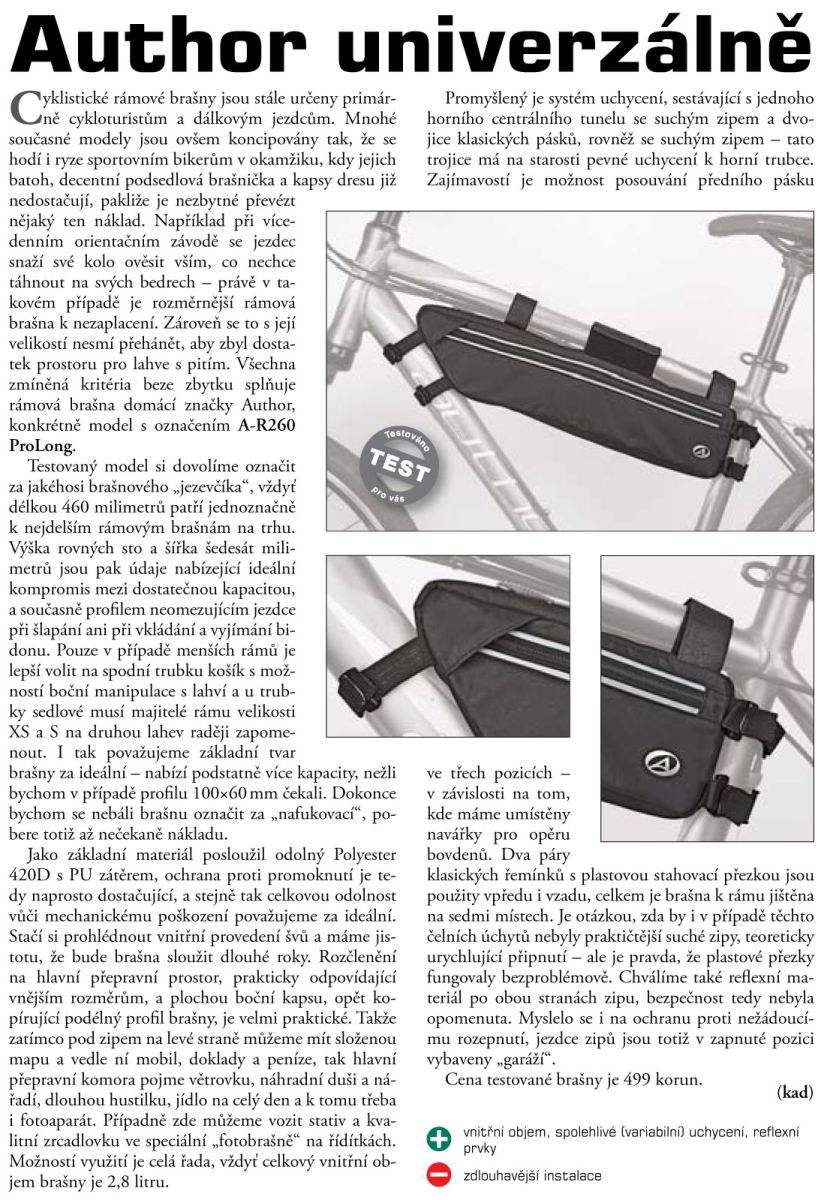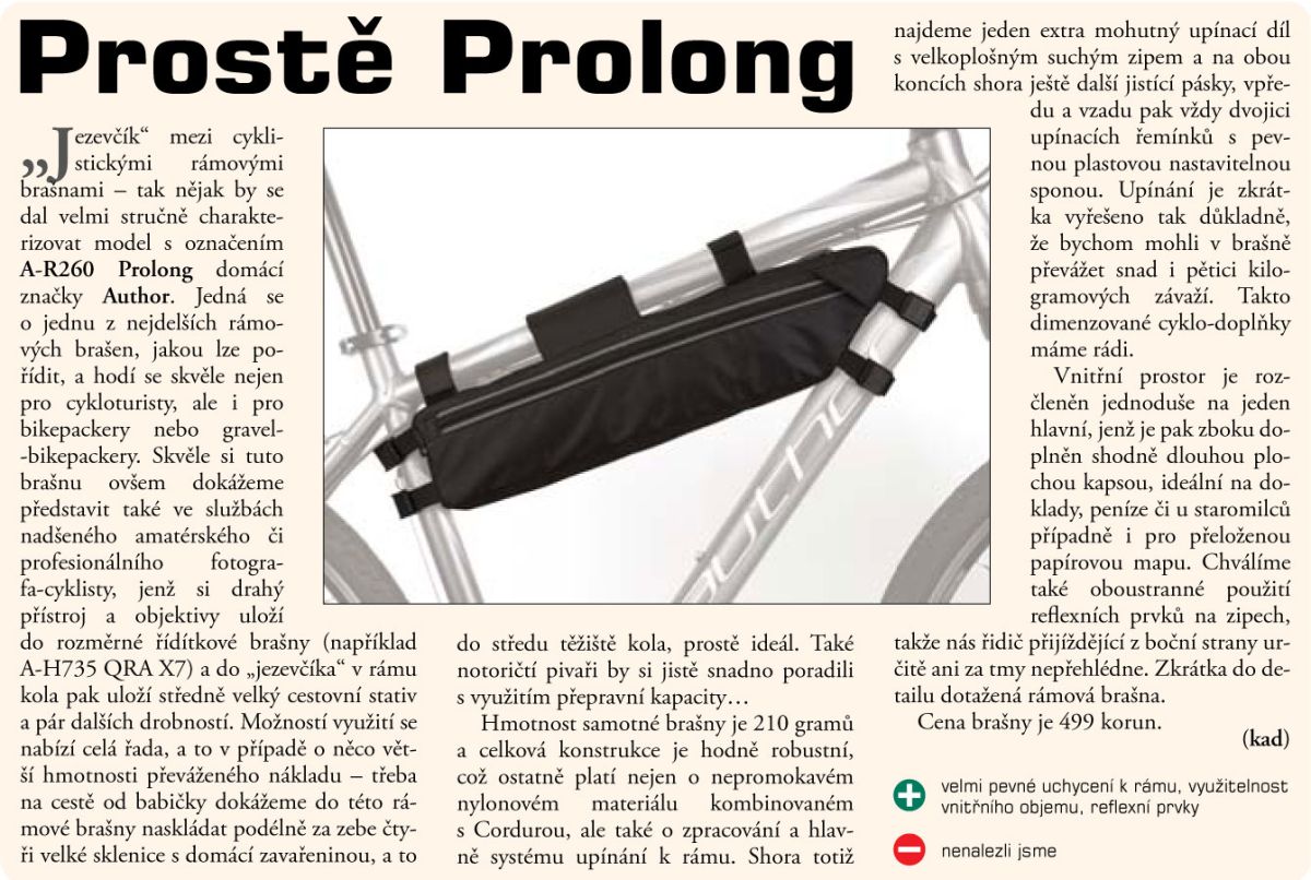 Brašna do rámu Author A-R260 ProLong je universální brašna s 1 hlavní kapsou a 1 plochou kapsou. Navržena s důrazem na dlouhou životnost a spokojené používání. Jednoduché a pevné uchycení suchým zipem.