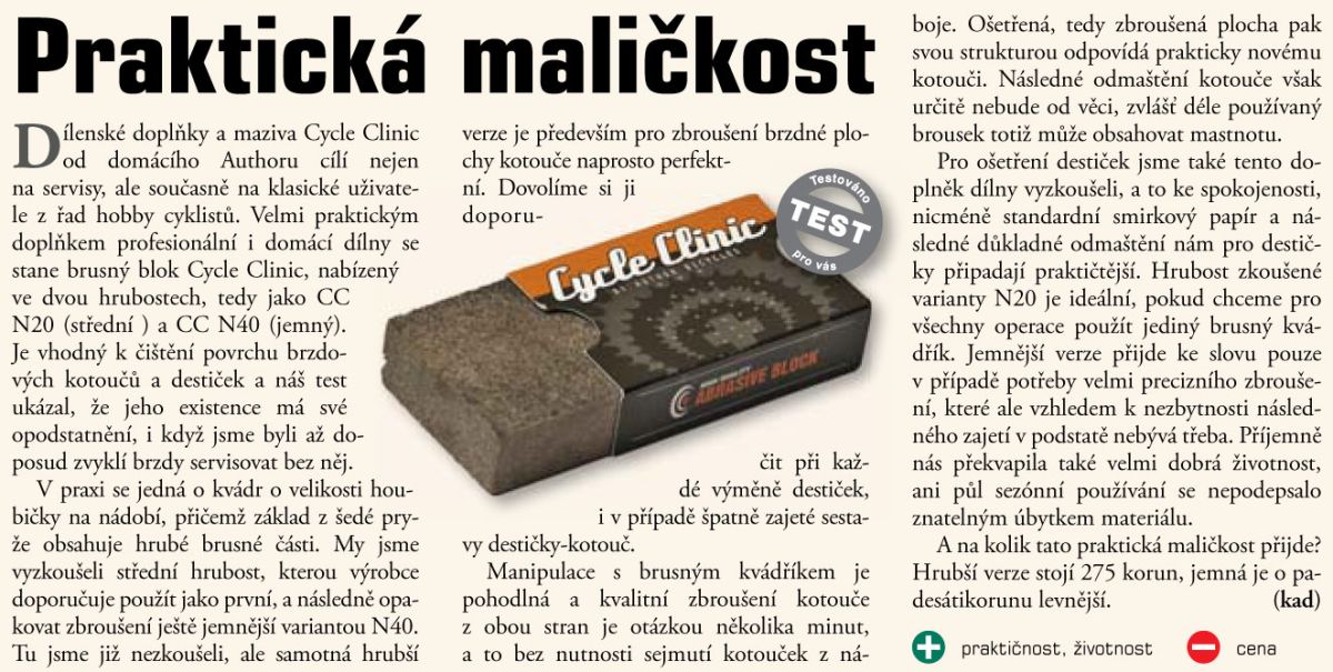 Brusný blok Cycle Clinic je elastické brusivo určené pro čištění povrchu brzdných ploch ráfků a brzdových kotoučů. Vyčištěním brzdných ploch zvýšíte brzdný výkon. Blok může být použit na suchém nebo mokrém povrchu, nebo s mýdlovou vodou. Doporučujeme požít nejprve hrubší CC N20 pro základní čištění a jemný CC N40 pro konečnou úpravu.