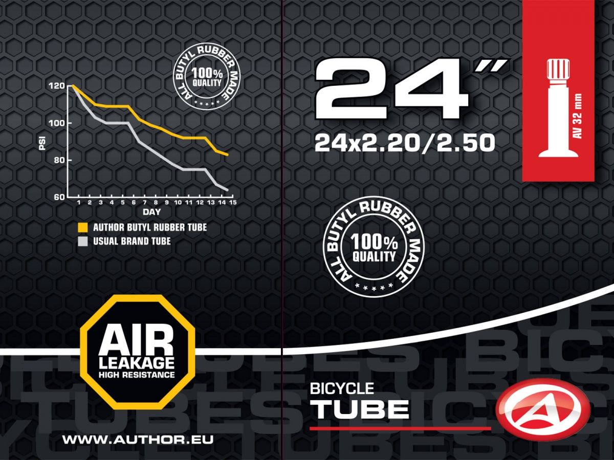 Duše AUTHOR 24x2.20-2.50 vyrobená ze 100% butylové pryže s velmi nízkou propustností pro plyny. Udrží tlak vzduchu v pneumatice jízdního kola po delší dobu, než duše vyrobené ze syntetické pryže.