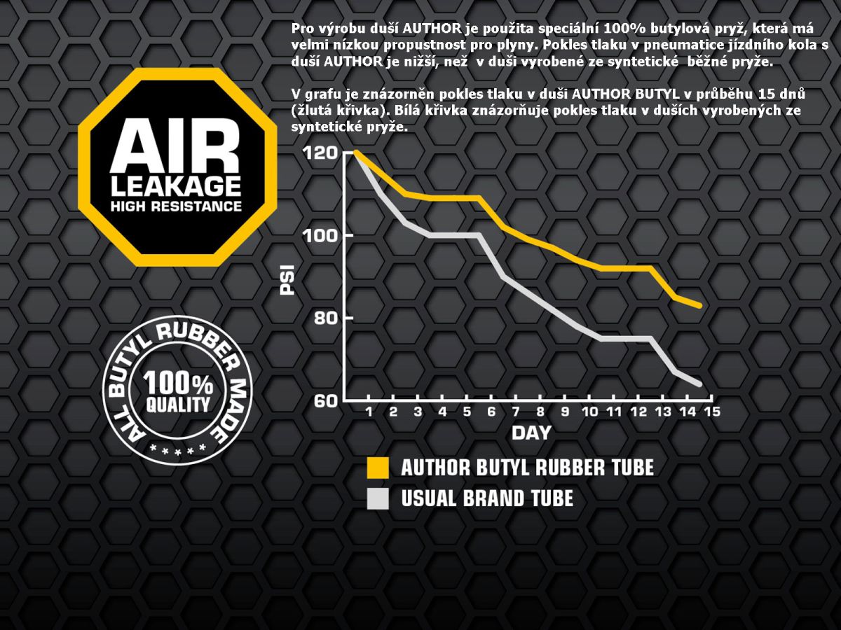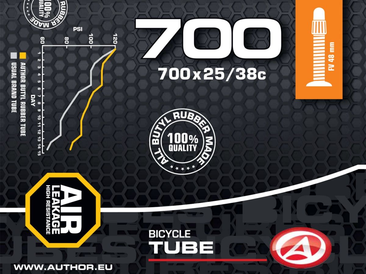 Duše AUTHOR 700x25/38C vyrobená ze 100% butylové pryže s velmi nízkou propustností pro plyny. Udrží tlak vzduchu v pneumatice jízdního kola po delší dobu, než duše vyrobené ze syntetické pryže.