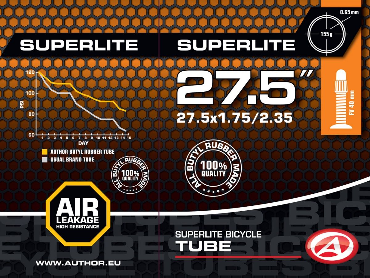 Duše AUTHOR SuperLite 27.5x1.75/2.35 se ztenčenou stěnou, vyrobená ze 100% butylové pryže s velmi nízkou propustností pro plyny. Udrží tlak vzduchu v pneumatice jízdního kola po delší dobu, než duše vyrobené ze syntetické pryže..
