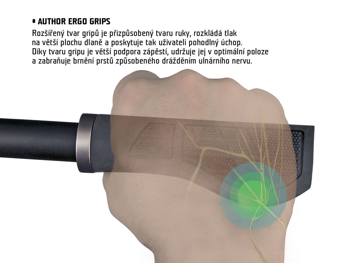 Ergonomické gripy AUTHOR R355 pro velmi pohodlný úchop a podporu rukou. Křídlový tvar gripu a MicroTech povrch je přizpůsobený tvaru ruky, dokonale rozkládá tlak na větší plochu dlaně a poskytuje tak uživateli pohodlný úchop. Zároveň svým tvarem pomáhá držet zápěstí v optimální poloze, účinně se tak snižuje zatížení zápěstí a zabraňuje se brnění prstů.