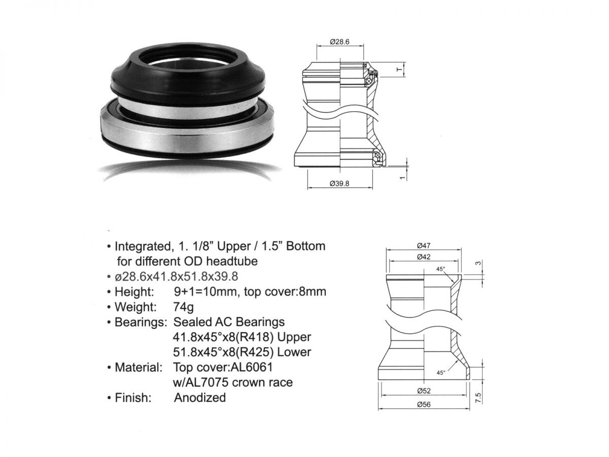 * 1 1/8" horní; 1,5" spodní; d. 28.6x41.8x51.8x39.8; H:9+1=10mm, vrchní krytka 8mm; * Materiál: AL6061 / AL7075 * kuličková ložiska s těsněním