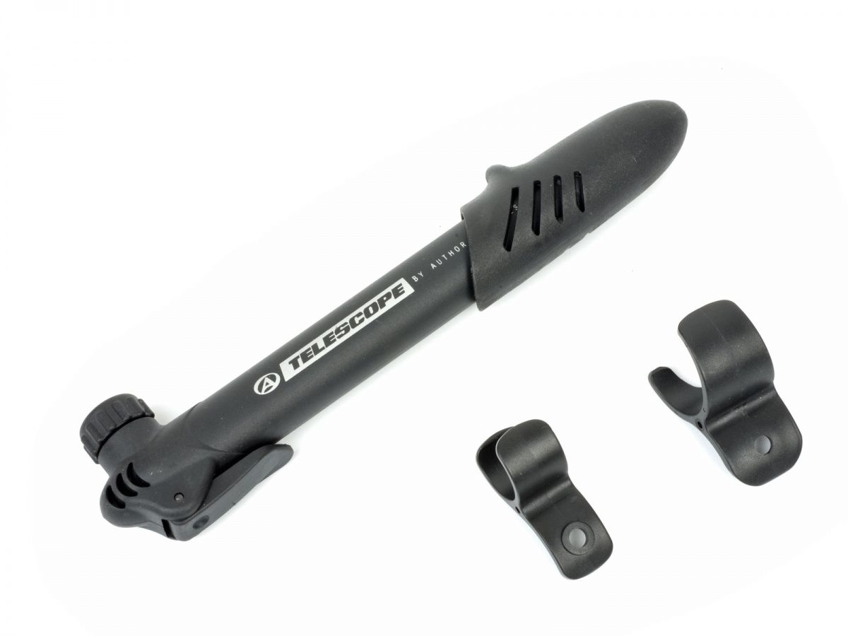 Hustilka Author Telescope s teleskopickým pístem. Zajištění koncovky na ventilu a ergonomická rukojeť pro pohodlné držení. Otočný adaptér pro ventily FV / AV / DV. Malá velikost je vhodná do kapsy většiny cyklistického oblečení, jednoduché uchycení držáku na rám kola.