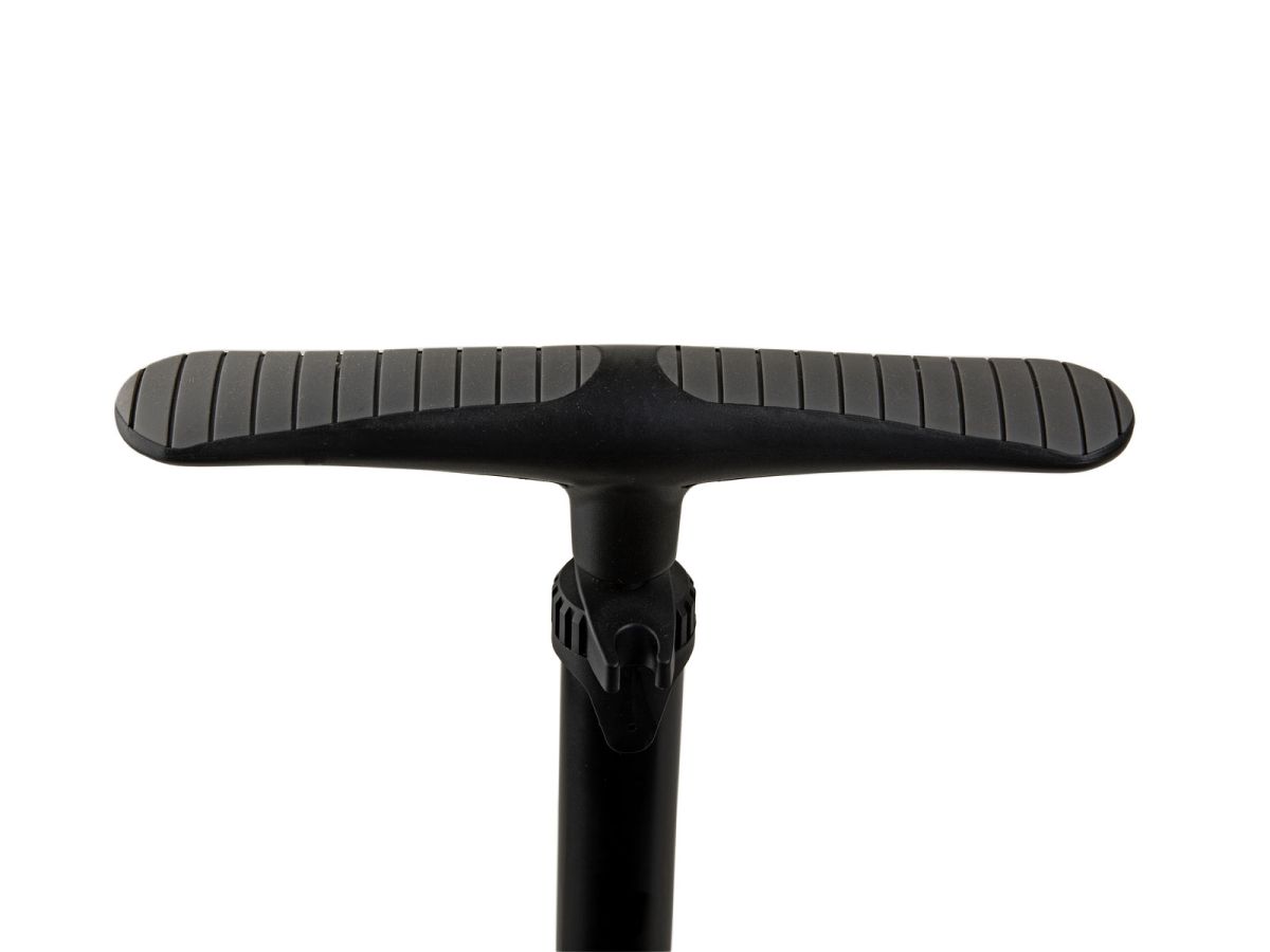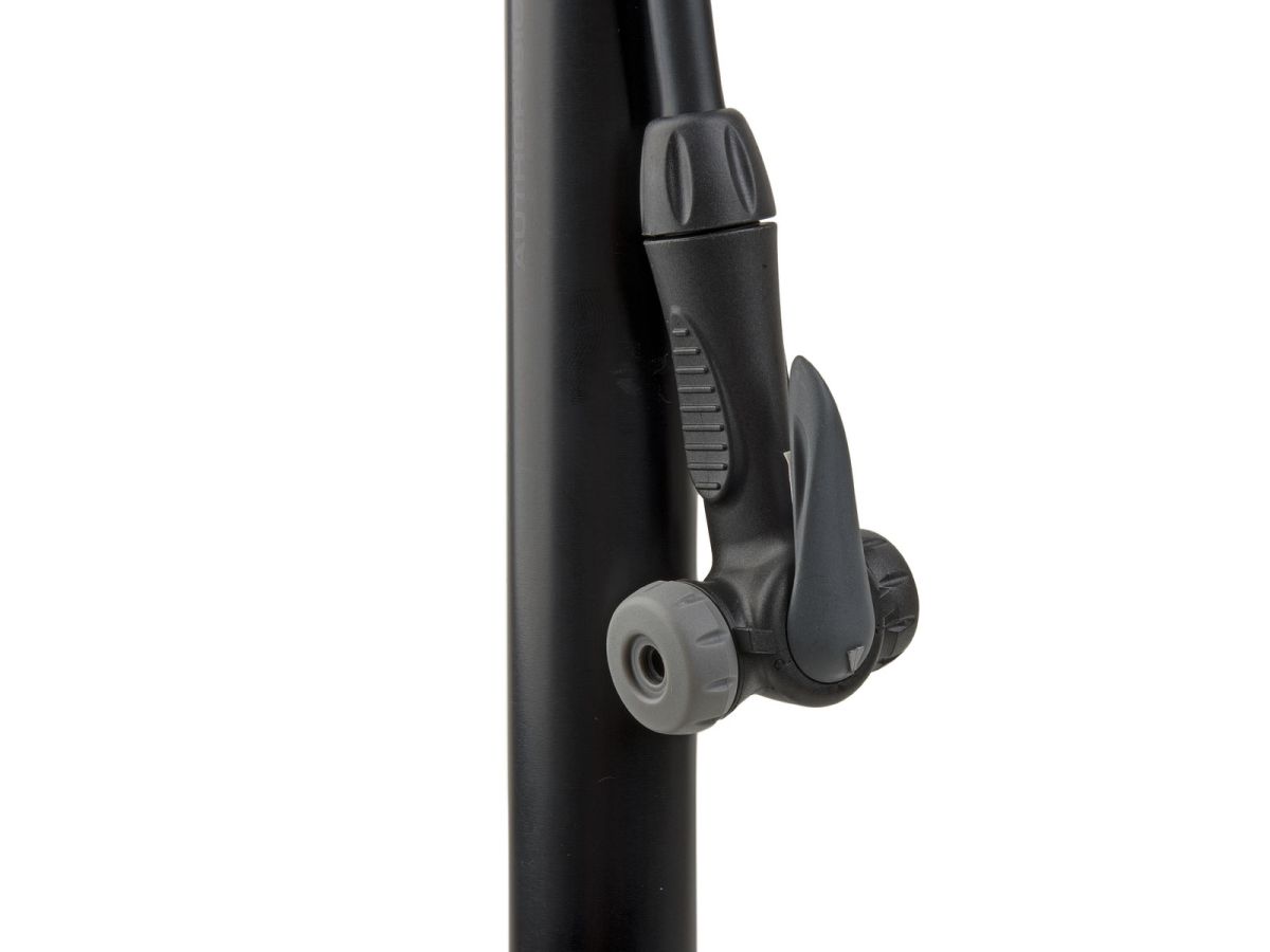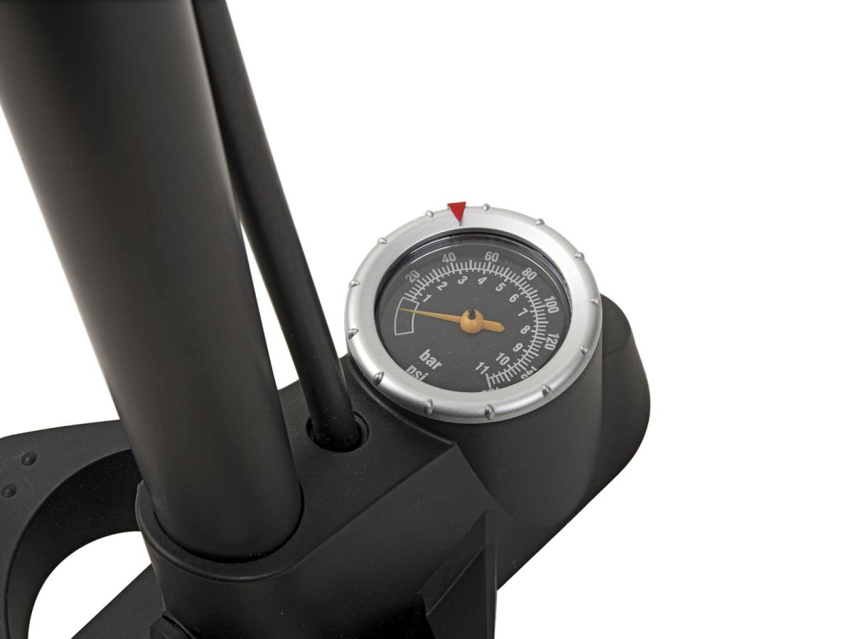 Nožní hustilka s manometrem, univerzální DualHead 2 oboustranná hlava pro všechny typy velo ventilků. Materiál kompozit / ocel. Válec d. 32 mm × l. 540 mm, max. tlak 160 PSI (1,1 MPa).