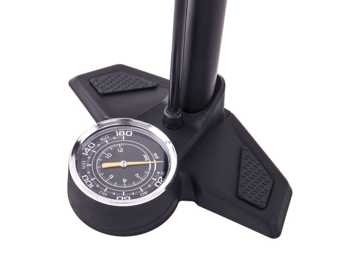 Nožní hustilka AUTHOR Power Jet 3 s ocelovým válcem umístěným na velmi stabilní ocelové základně s extra velkými opěrkami pro nohy. Funguje hladce a spolehlivě. Velký, snadno čitelný manometr umožňuje přesné měření tlaku, ať už doma, v dílně nebo na trailech.