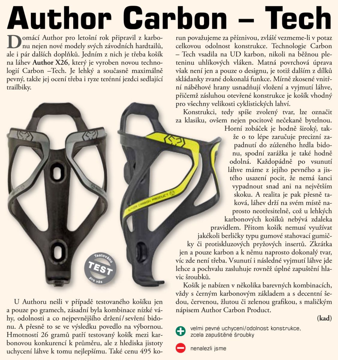 Košík na láhev AUTHOR X26 je vyroben novou Carbon–Tech technologií. Je velmi lehký a pevný. Tvarované vnitřní hrany usnadňují vložení a vyjmutí láhve. Díky otevřené konstrukci je vhodný pro všechny velikosti cyklistických lahví. Matná karbonová povrchová úprava skvěle vypadá a perfektně funguje.