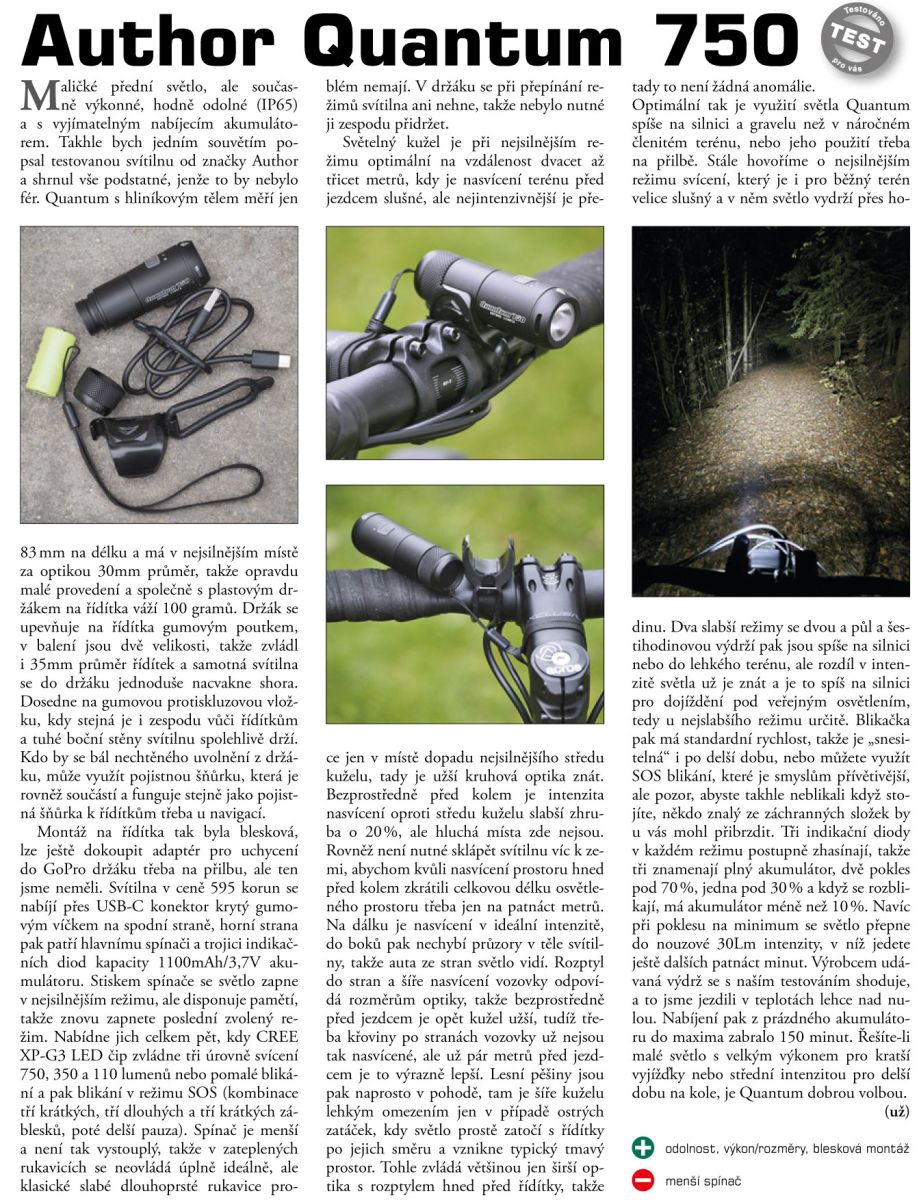 AUTHOR QUANTUM 750 L-Run je USB dobíjecí světlo s velkou parabolou a CREE XP-G3 LED čipem 750 lumenů. Toto světlo nabízí 5 režimů, které se přizpůsobí jízdě ve městě nebo v terénu. Parabola se sklem je upevněna v pouzdře z duralu a je vyrobena tak, aby maximalizovala světelný výkon a optimalizovala tvar osvětlené plochy. Velmi praktický je LED indikátor kapacity baterie, který přesně informuje o stavu baterie, snadno tedy přizpůsobíte režim svícení kapacitě baterie tak, abyste byli osvětleni.