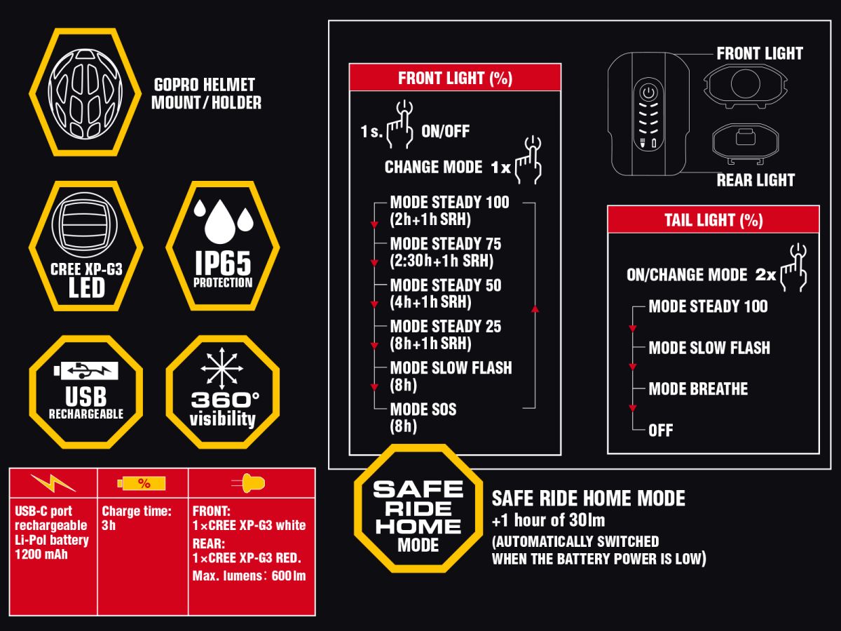 - Safe Ride Home mode – při nízké kapacitě baterie se světlo automaticky přepne do úsporného režimu se svítivostí 30 lm, ve kterém vydrží svítit 1 hodinu.