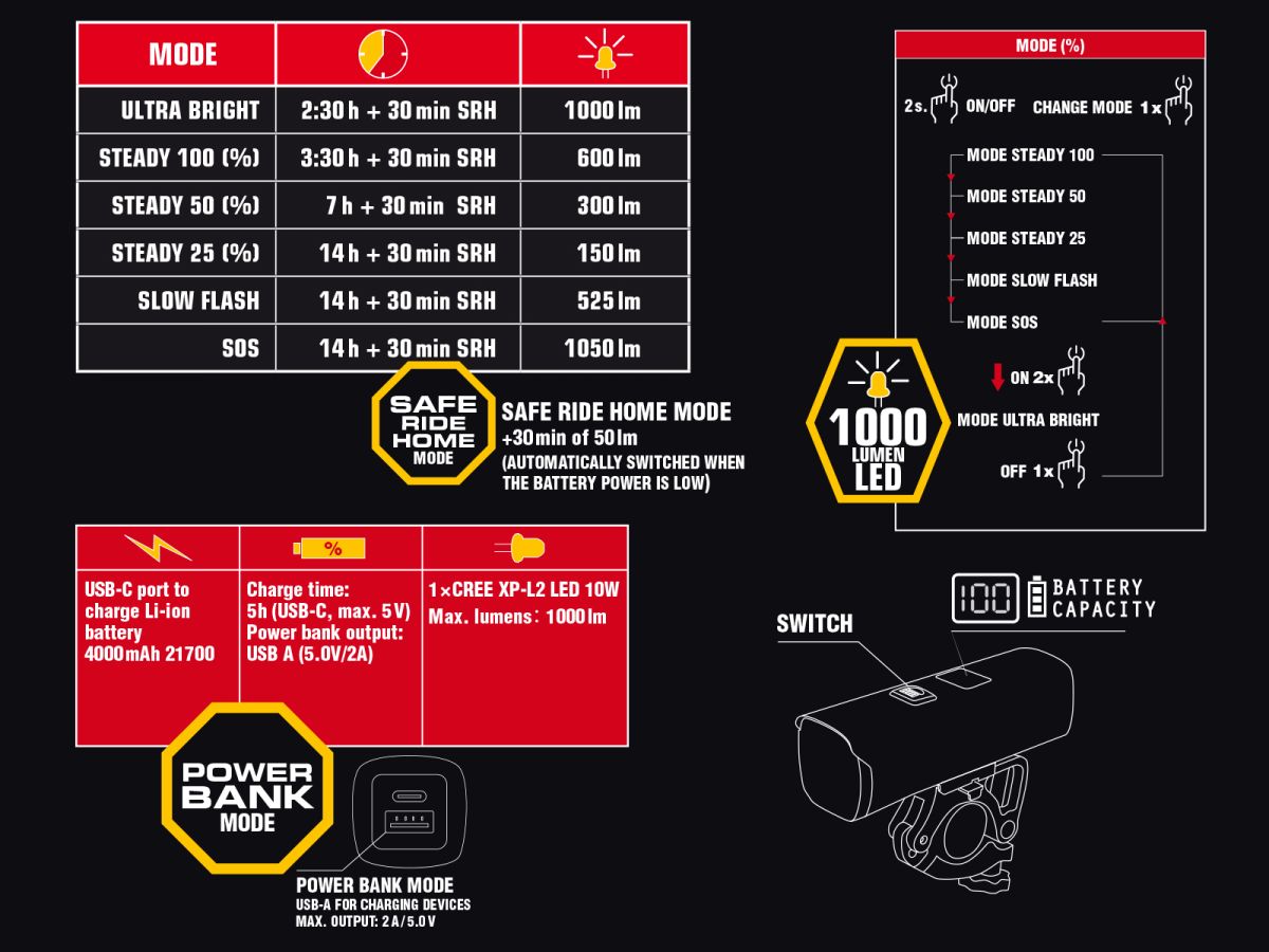 - Safe Ride Home mode – při nízké kapacitě baterie se světlo automaticky přepne do úsporného režimu, ve kterém vydrží svítit dalších 30 minut.