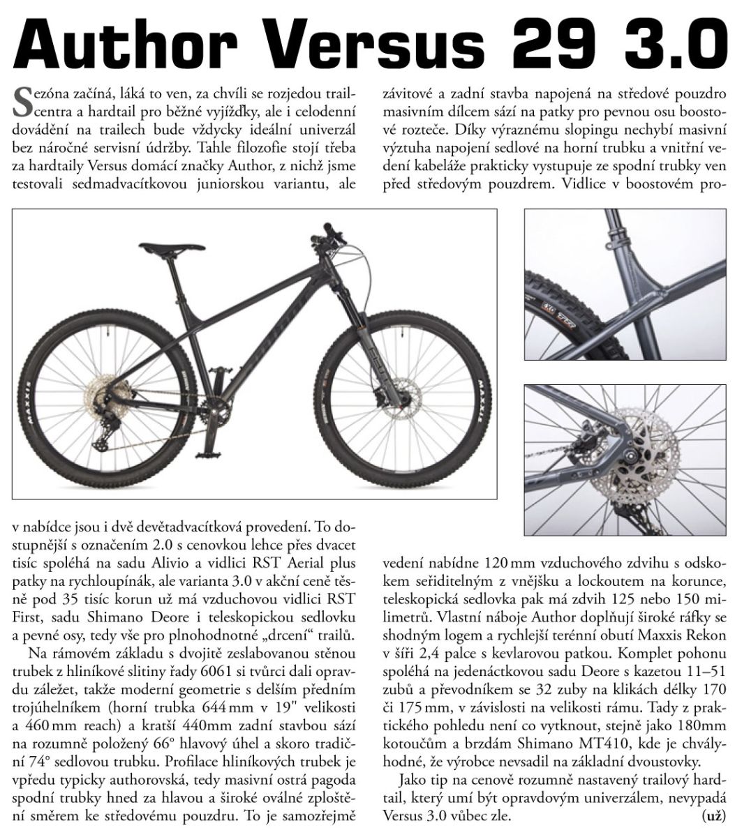 Trailové 29“ kolo s kvalitním osazením a moderní geometrií. Odolný a přitom lehký duralový rám s pevnými osami a velkým slopingem zajistí Authoru Versus 29 3.0 perfektní obratnost i na náročných technických tratích. Velká kola umožňují skvělou průchodnost terénem, snadné překonávání nerovností a také relativně nízký valivý odpor při asfaltových přesunech. Vzduchová vidlice RST s lockoutem, pevnou boostovou osou a zdvihem 120 mm si poradí i s velmi těžkými traily. Zdolání prudkých sjezdů usnadní teleskopická sedlovka Kind Shock. 11rychlostní řazení s jednopřevodníkem má na starosti sada Shimano Deore, od stejného výrobce jsou spolehlivé hydraulické kotoučové brzdy s velkými disky. Objemné pláště Maxxis Rekon nabízí jistotu v jakémkoliv terénu, nezaleknou se ani hlubokého bláta a skvěle drží i na mokrých kořenech. Tento stroj se cítí nejlépe na jezdivých rychlých singltrecích, kde nabídne perfektní ovladatelnost a moře zábavy. Neztratí se ale ani v bikeparku plném skoků a lavic, zvládne i wallride a menší dropy. Tedy skoro všechno jako mnohem dražší celoodpružené modely. Na rozdíl od nich ale umožňuje i svižné přesuny po lesních či polních cestách. Dobře tak může fungovat i jako univerzální kolo pro vyznavače trailového ježdění, kteří se nechtějí spoléhat jen na lanovky a vleky. S tímto kolem si užijete i výjezd na kopec a ještě více následný sjezd. To vše za zlomek ceny sjezdových či enduro speciálů.