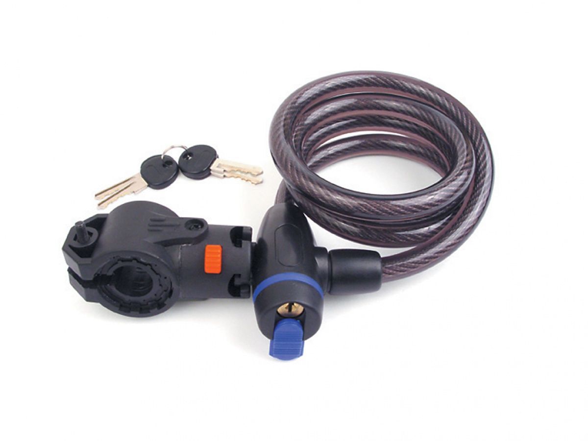 Spirálový lankový zámek s univerzálním otočným držákem na sedlovku, lanko ocel l. 1200 mm, 4x klíč, hmotnost 337 g.