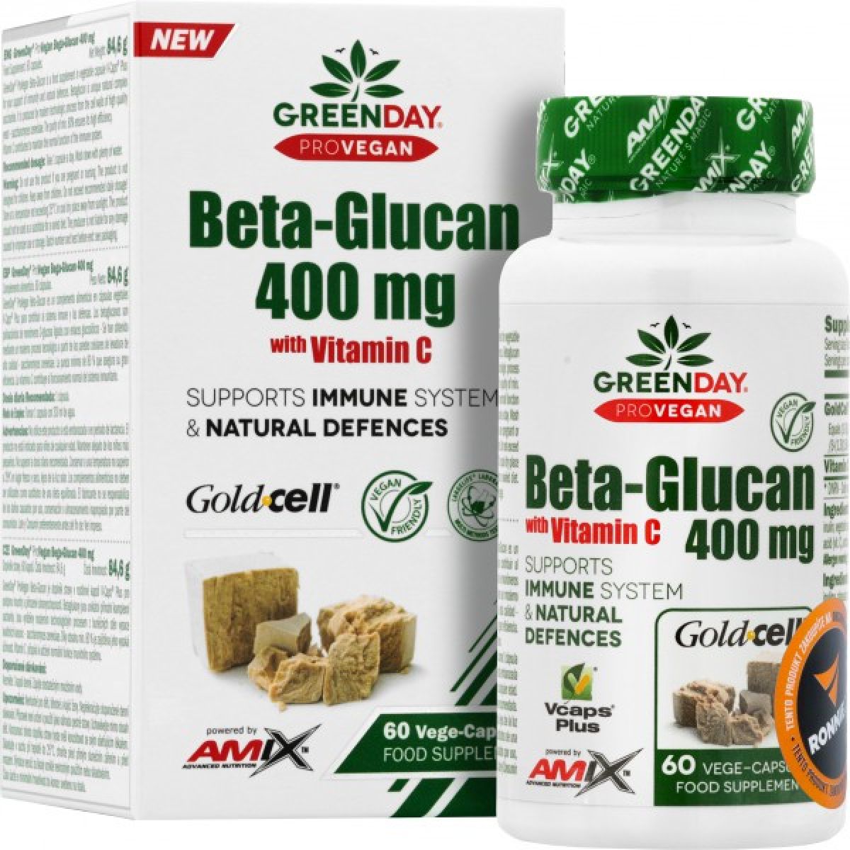 Beta glukan je unikátní přírodní komplex sacharidů vyrobený moderním technologickým procesem z buněčných stěn vysoce kvalitních kvasnic (Saccharomyces cerevisiae) - Goldcell. Díky obsahu min. 80 % je zajištěna jeho vysoká účinnost. Vitamín C přispívá k udržení normální funkce imunitního systému.
