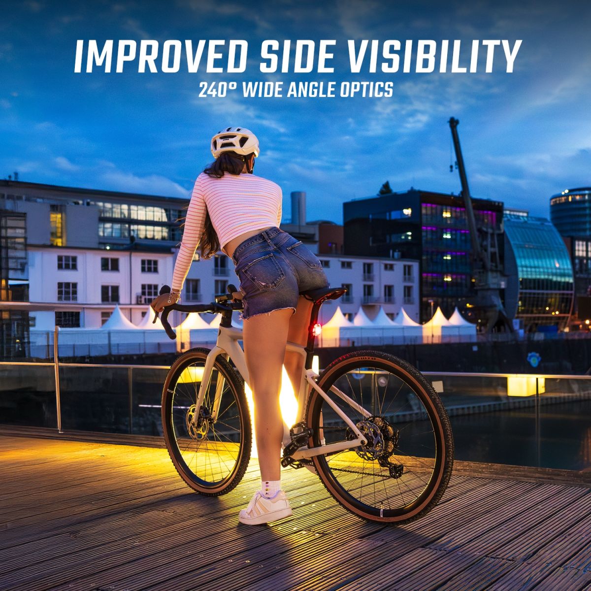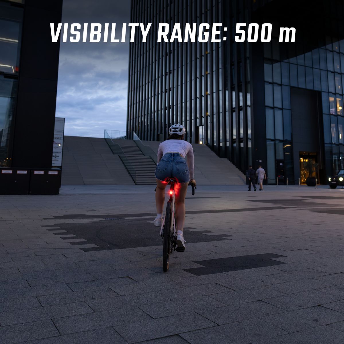 Malé a lehké zadní světlo s funkcí blikání a nabíjením přes USB-C zajišťuje spolehlivou viditelnost v silničním provozu. Boční viditelnost 240°, výdrž baterie až 33 hodin a dosah viditelnosti 500 metrů dělají ze zadního světla ideálního společníka pro dojíždějící i každodenní jezdce.