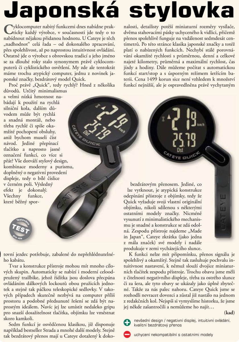 Bezdrátový cyklopočítač CATEYE s inverzním displejem (displej černý, číslice světlé). 7 funkcí: denní / celková vzdálenost, okamžitá / průměrná / max. rychlost, čas jízdy, hodiny; doplňkové funkce: aut. funkce START / STOP, funkce Pacer - indikátor (šipky) poměřující okamžitou a průměrnou rychlost, nastavitelná celková vzdálenost, bezdrátový přenos na vzdálenost až 70cm, předsunutý držák na řídítka.