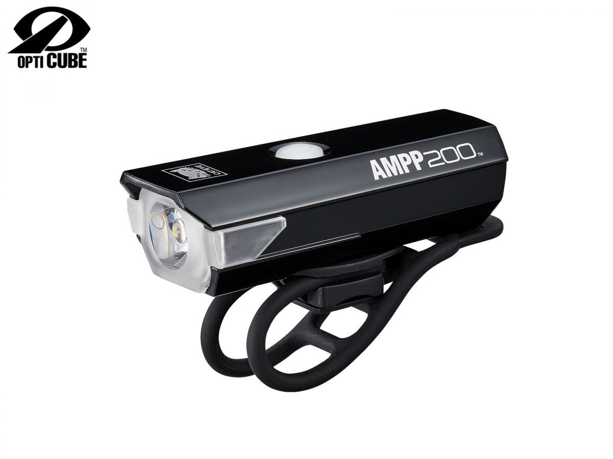 Přední dobíjecí světlo CATEYE AMPP200 s technologií OptiCube (speciální konstrukce optických čoček usměrňující tok světla pro lepší osvícení vozovky). Indikátor kapacity akumulátoru a dobíjení integrovaný do vypínače.