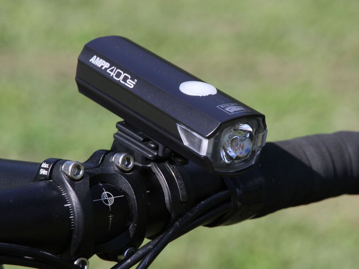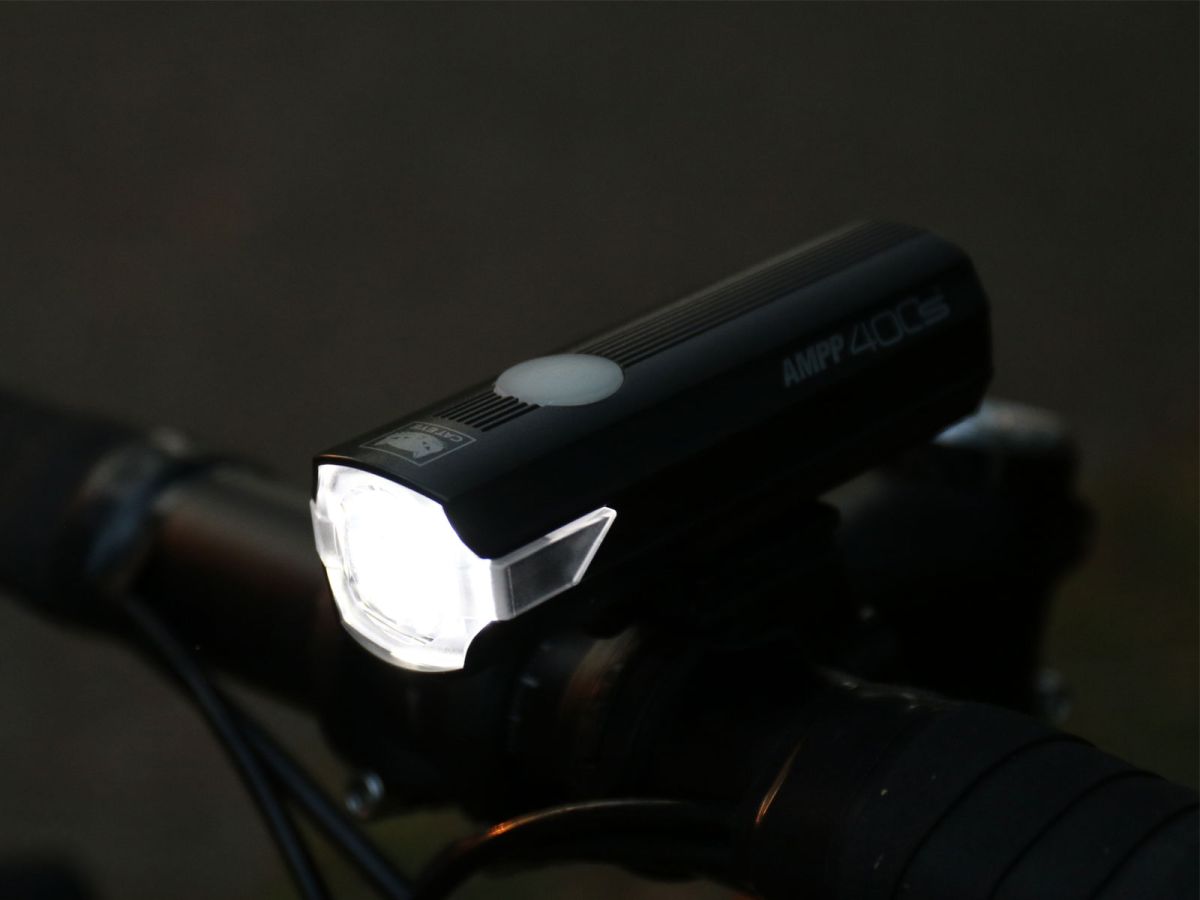Přední dobíjecí výkonné (400lm) světlo CATEYE AMPP400S s technologií OptiCube (speciální konstrukce optických čoček usměrňující tok světla pro lepší osvícení vozovky). Indikátor kapacity akumulátoru a dobíjení integrovaný do vypínače. Hmotnost s držákem 120 g.