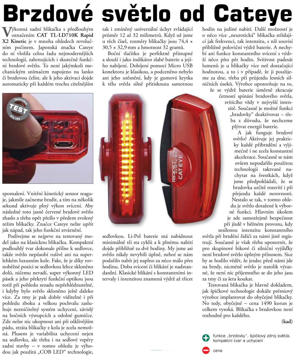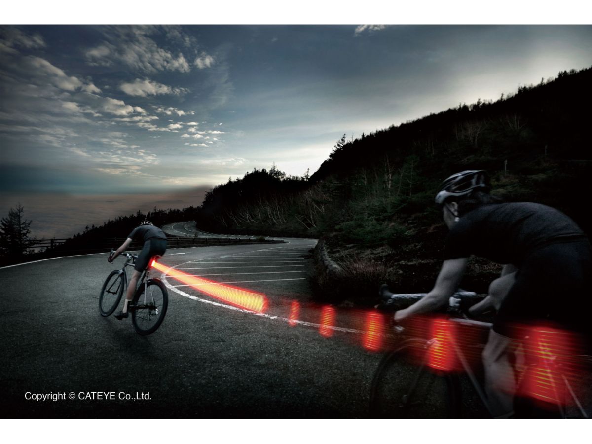 Zadní "brzdové" světlo - blikačka CATEYE využívající LED v pásku. Vysoce výkonné světlo (50lm a rozsah 180°) využívající technologii, která umí rozpoznat zpomalení. Pokaždé když zpomalíte se světlo přepne do nejvyšší intenzity svícení (na 2,5s) a upozorní jezdce/řidiče za vámi, že brzdíte. Uchycení pomocí gumičky. Kontrolka na stav baterie a automatické přepnutí do režimu blikání pokud se kapacita baterie výrazně sníží. Světlo je napájeno Li-pol baterií s USB dobíjením (2h). 3 režimy svícení - blikání s výdrží: až 5h - konstantní svícení a 30h blikání podle vybraného režimu.