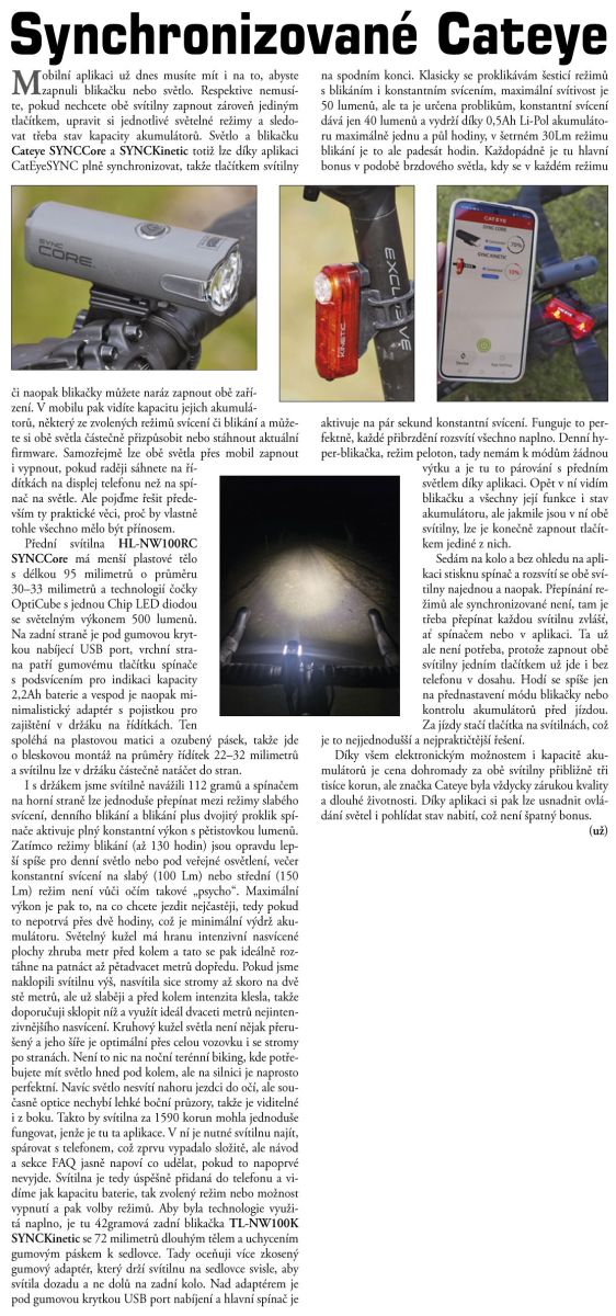 Zadní "brzdové" světlo - blikačka CATEYE s funkcí funkcí synchronizace s předním světlem (SYNCCore) a mobilním telefonem (aplikace CatEyeSYNC). Obě světla lze pak zapnout a vypnout pouze jedním tlačítkem a pomocí mobilní aplikace kontrolovat stav baterie a vybírat používané režimy svícení. Světlo má výkon až 50lm s viditelností 180° a využívající technologii, která umí rozpoznat zpomalení. Pokaždé když zpomalíte se světlo přepne do nejvyšší intenzity svícení (na 2,5s) a upozorní jezdce/řidiče za vámi, že brzdíte. Světlo má také režim svícení pro jízdu ve skupině nebo jízdu ve dne. Uchycení pomocí gumičky. Kontrolka na stav baterie a automatické přepnutí do režimu blikání pokud se kapacita baterie výrazně sníží. Světlo je napájeno Li-pol baterií s USB dobíjením (2,5h). 6 režimů svícení - blikání s výdrží: až 1,5h - konstantní svícení (40lm) a 50h blikání podle vybraného režimu.