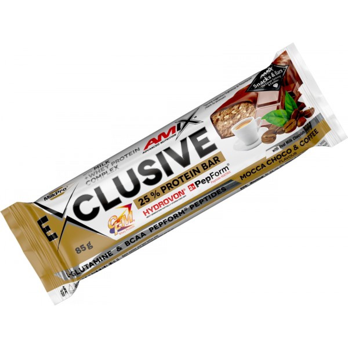 - MilkPro® Protein Blend 19,7 % [mléčný proteinový izolát, CFM syrovátkový proteinový izolát a koncentrát, částečně hydrolyzovaný syrovátkový proteinový izolát - HydroVon®, hydrolyzované syrovátkové peptidy PepForm® (L-glutamin, BCAA)], mléčná čokoláda 15 % (cukr, kakaové máslo, sušené plnotučné mléko, kakaová hmota, kakaový prášek, emulgátory sójový lecitin a E 476, vanilkový extrakt, aroma), plnidlo polydextróza, hydrolyzované hovězí peptidy Hydrobeef™, rostlinný tuk (palmojádrový olej, palmový a bambucký olej), sójový proteinový izolát, fruktóza, zvlhčovadlo glycerol, glukóza, zvlhčovadlo sorbitol, maltodextrin, 2,5 % rýžové křupinky (rýže, polynol monoglycerid z palmového oleje), emulgátor sójový lecitin, čištěná voda, kakaový prášek, aroma, káva, chlorid sodný, antioxidant směs tokoferolů D