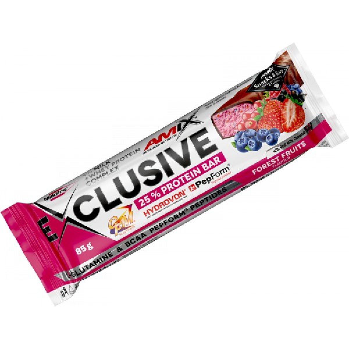 - MilkPro® Protein Blend 19,5 % [mléčný proteinový izolát, CFM syrovátkový proteinový izolát a koncentrát, částečně hydrolyzovaný syrovátkový proteinový izolát - HydroVon®, hydrolyzované syrovátkové peptidy PepForm® (L-glutamin, BCAA)], mléčná čokoláda 15 % (cukr, kakaové máslo, sušené plnotučné mléko, kakaová hmota, kakaový prášek, emulgátory sójový lecitin a E 476, vanilkový extrakt, aroma), plnidlo polydextróza, sójový proteinový izolát, fruktóza, hydrolyzované hovězí peptidy Hydrobeef™, zvlhčovadlo glycerol, glukóza, rostlinný tuk (palmojádrový olej, palmový a bambucký olej), sušené odtučněné mléko, zvlhčovadlo sorbitol, 3 % kousky malin (koncentrované jablečné pyré, malinové pyré, cukr, pšeničná vláknina, želírující látka pektin, barvivo koncentrát z mrkve, černého rybízu a borůvky), 3 % sušené borůvky (borůvky, koncentrát z citronové šťávy, slunečnicový olej), maltodextrin, emulgátor sójový lecitin, čištěná voda, regulátor kyselosti kyselina citronová, aroma, barvivo řepný extrakt, antioxidant směs tokoferolů D