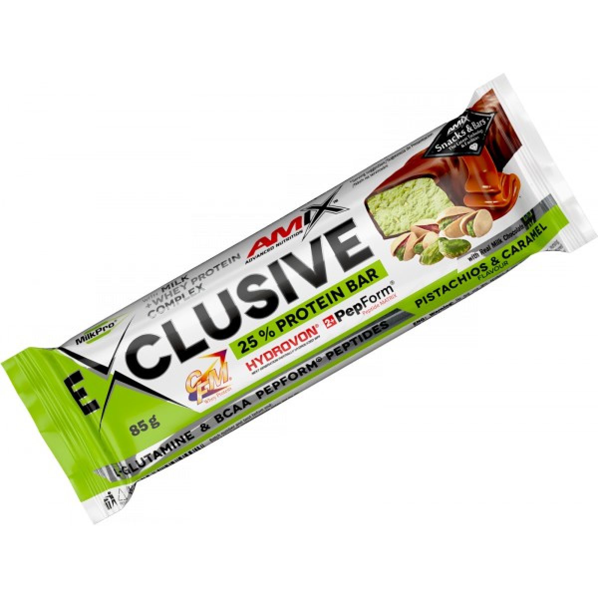 - MilkPro® Protein Blend 19,8 % [mléčný proteinový izolát, CFM syrovátkový proteinový izolát a koncentrát, částečně hydrolyzovaný syrovátkový proteinový izolát - HydroVon®, hydrolyzované syrovátkové peptidy PepForm® (L-glutamin, BCAA)], mléčná čokoláda 15 % (cukr, kakaové máslo, sušené plnotučné mléko, kakaová hmota, kakaový prášek, emulgátory sójový lecitin a E 476, vanilkový extrakt, aroma), plnidlo polydextróza, hydrolyzované hovězí peptidy Hydrobeef™, fruktóza, zvlhčovadlo glycerol, glukóza, sušené odtučněné mléko, rostlinný tuk (palmojádrový olej, palmový a bambucký olej), 4,2 % rýžové burizony (rýže 98 %, polynol - monoglycerid z palmového oleje), sójový proteinový izolát, 3,8 % loupaná jádra pistácií, zvlhčovadlo sorbitol, maltodextrin, emulgátor sójový lecitin, čištěná voda, regulátor kyselosti kyselina citronová, aroma, barvivo chlorofylin měďnatý, antioxidant směs tokoferolů D