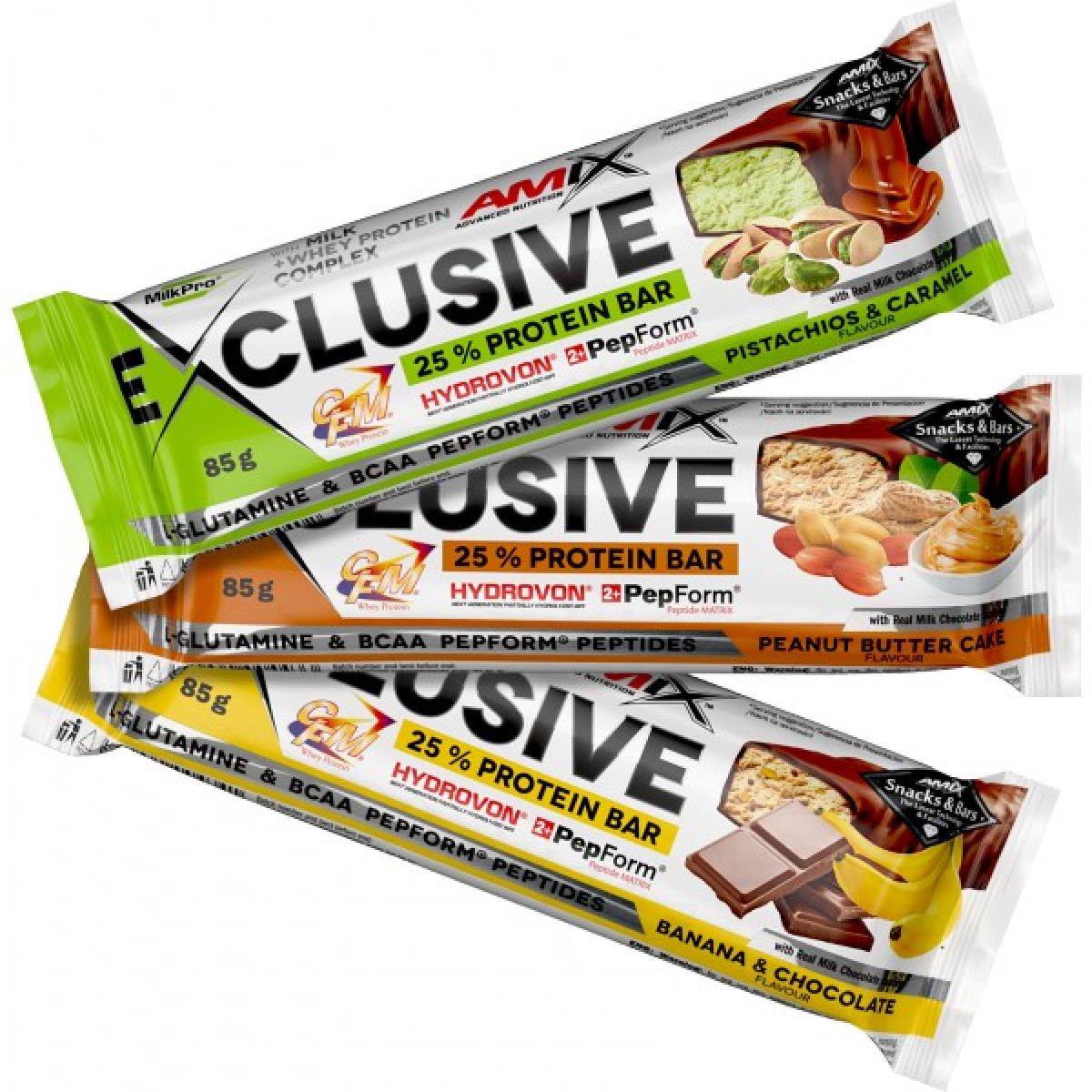 - MilkPro® Protein Blend 19,6 % [mléčný proteinový izolát, CFM syrovátkový proteinový izolát a koncentrát, částečně hydrolyzovaný syrovátkový proteinový izolát - HydroVon®, hydrolyzované syrovátkové peptidy PepForm® (L-glutamin, BCAA)], mléčná čokoláda 15 % (cukr, kakaové máslo, sušené plnotučné mléko, kakaová hmota, kakaový prášek, emulgátory sójový lecitin a E 476, vanilkový extrakt, aroma), plnidlo polydextróza, hydrolyzované hovězí peptidy Hydrobeef™, sójový proteinový izolát, fruktóza, rostlinný tuk (palmojádrový olej, palmový a bambucký olej), zvlhčovadlo glycerol, glukóza, sušené odtučněné mléko, 3,9 % kousky banánu (banánové pyré, koncentrované hruškové pyré, koncentrovaná citronová šťáva, fruktózo-glukózový sirup, zvlhčovadlo glycerol, cukr, pšeničná vláknina, želírující látka pektin), zvlhčovadlo sorbitol, 2,5 % křupinky s kakaem (rýže, pšeničná mouka, cukr, kakaový prášek), emulgátor sójový lecitin, čištěná voda, regulátor kyselosti kyselina citronová, aroma, chlorid sodný, antioxidant směs tokoferolů D