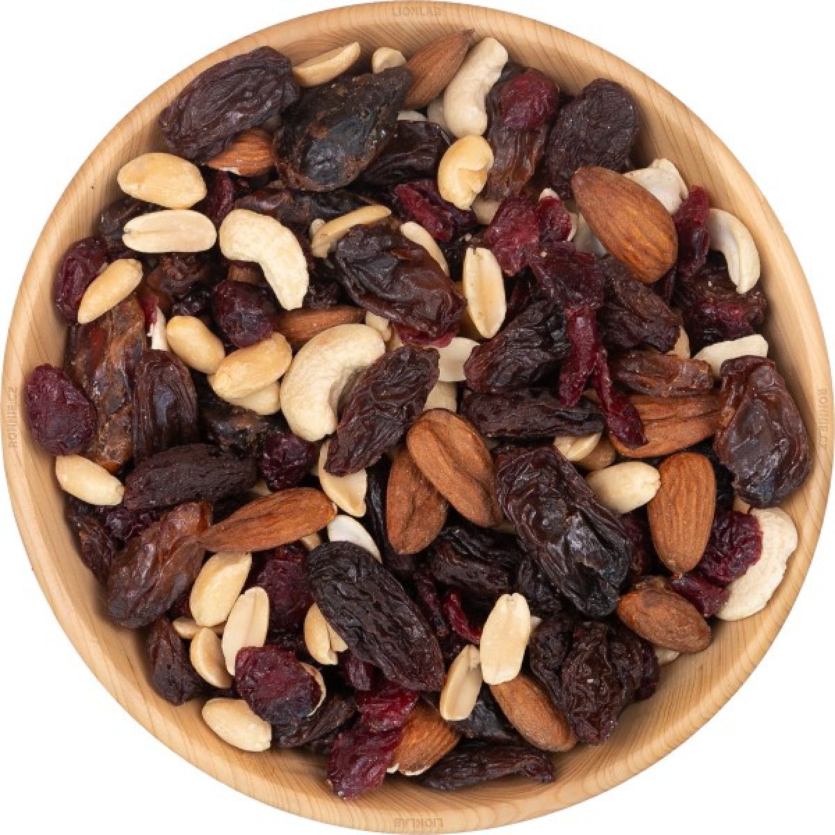 - 25 % rozinky (rozinky, rostlinný slunečnicový olej), 20 % arašídy pražené nesolené, 20 % klikva velkoplodá (klikva velkoplodá, cukr, rostlinný slunečnicový olej), 15 % datle sušené, 10 % kešu natural, 10 % mandle natural