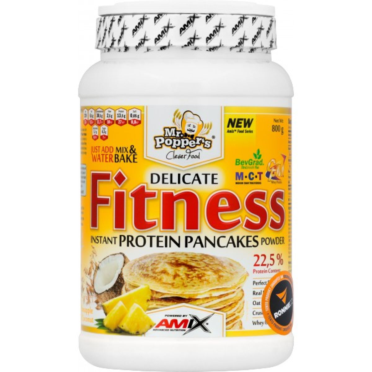 - ovesné vločky 27 %, extrudovaná ovesná mouka 15 %, extrudovaná rýžová mouka 15 %, směs proteinů (CFM syrovátkový proteinový izolát, syrovátkový proteinový koncentrát), sušené podmáslí, sušený jogurt 7 %, sušený vaječný žloutek, sušený vaječný bílek, emulgátor sójový lecitin, lyofilizované kousky jahod 2,5 %, triglyceridy se středně dlouhým řetězcem (MCT prášek – kyselina kaprylová/kapronová, kaseinát sodný, glukózový sirup, emulgátor E 472c), chlorid sodný, mleté lněné semínko (BevGrad™ XtraSmooth Flax), aroma, kypřicí látky uhličitan sodný a fosforečnan vápenatý, sladidla sukralóza a acesulfam K