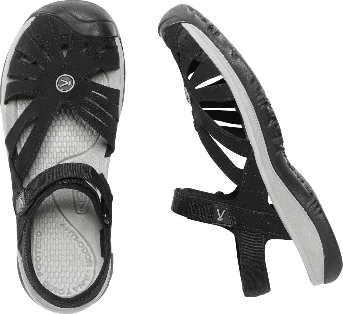 Dámský sandál všestranného použití vhodný k vodě, do lehčího terénu i do města, to je Keen Rose Sandal. Zapíná se páskem na suchý zip přes nárt. Svršek z polyesterové popruhoviny je rychleschnoucí, stejně jako podšívka. Stélka z pěnového materiálu EVA poskytuje oporu klenbě chodidla. Mezipodešev z téhož materiálu zaručuje dobré odpružení a lehkost. Podrážka je z odolné gumy, která nezanechává barevné stopy. Tvorbu mikroplísní a zápach uvnitř boty omezuje technologie ECO ODOR CONTROL šetrná k životnímu prostředí. Otvor pro vsunutí nohy do sandálu umožňuje rychlé a pohodlné prozutí. Model nepostrádá ani důležitou ochranu prstů, která je však natolik subtilní, že zachovává jeho elegantní vzhled.