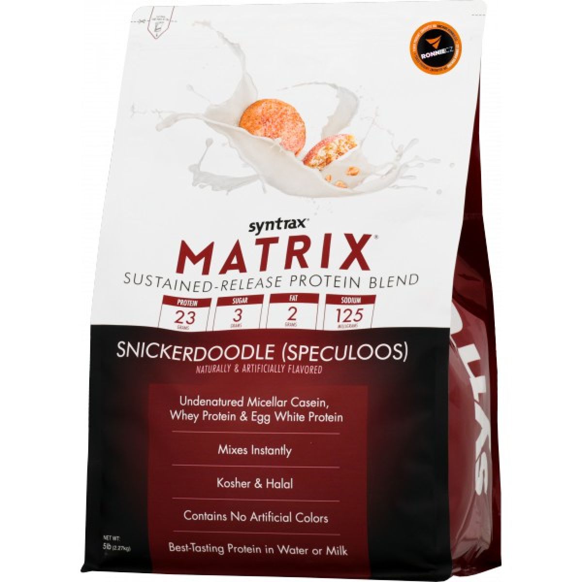 - mléčná proteinová směs (ultrafiltrovaný a nedenaturovaný syrovátkový proteinový koncentrát, ultrafiltrovaný a nedenaturovaný micelární kasein), nemléčná proteinová směs (glutaminové peptidy, nedenaturovaný protein vaječného bílku), kousky sušenek [obohacená mouka (pšeničná mouka, niacin, redukované železo, thiamin mononitrát, riboflavin, kyselina listová), cukr, vysoce olejnatý olej ze světlice bavířské, sůl, uhličitan sodný, vanilin], lecitin, sůl, přírodní a přírodně identická aromata, skořice, acesulfam K, sukralóza