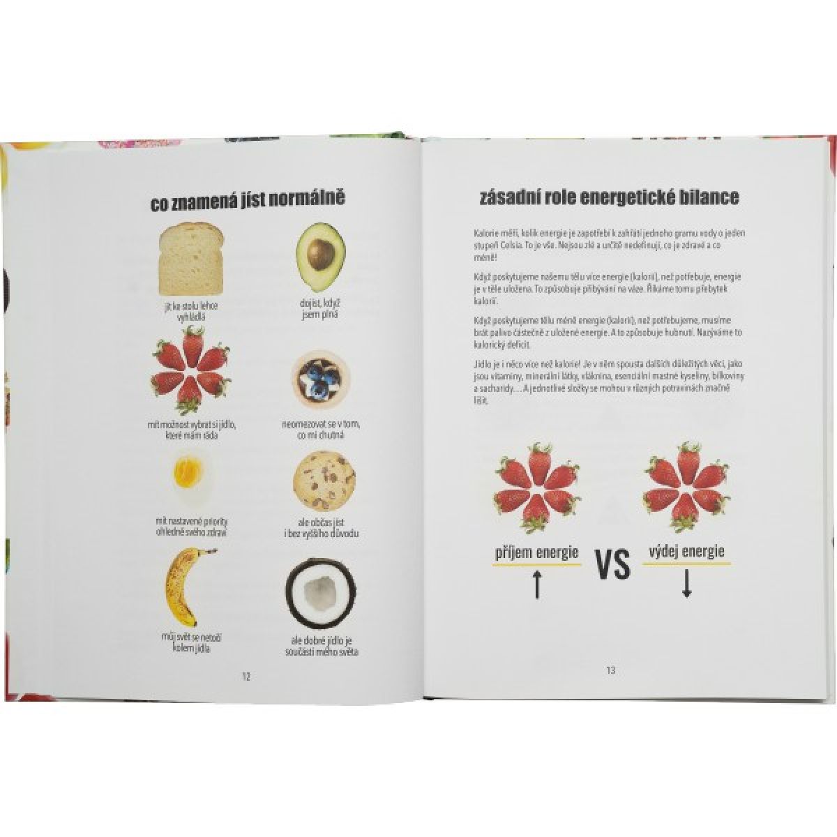 Představ si dva talíře. Talíř zeleniny a talíř sušenek. Polož si dvě otázky. Kolik energie je na každém talíři? Kolik živin je na každém talíři? Talíř sušenek má docela hodně energie, ale málo živin. Naopak talíř zeleniny má docela málo energie, ale živin podstatně více. To je zdravý způsob, jak o jídle přemýšlet. Jídlo není špatné, dobré, opravdové, neopravdové. Jídlo je jídlo. Kniha chce vnuknout myšlenku, jak jíst normálně. A co to je? Cítit se dobře po fyzické i psychické stránce, mít informace o tom, co strava obsahuje, ale nenechat se tím v určitých situacích zbytečně omezovat.