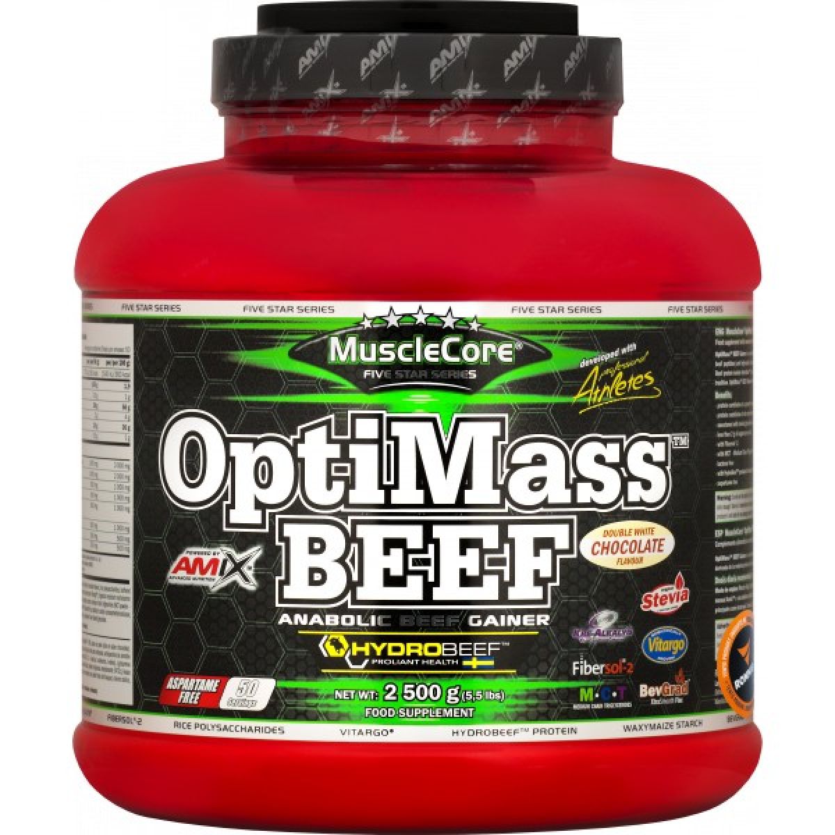 - glukózové polymery (maltodextrin), hydrolyzované hovězí peptidy HydroBeef™ - 30 %, kakaový prášek (pouze pro příchuť čokoláda), rýžové polysacharidy, pufrovaný kreatin monohydrát (Kre-Alkalyn®), ultra vysokomolekulární hydrolyzovaný škrob z voskové kukuřice s dlouhým řetězcem, amylopektin ječný škrob (Vitargo®), maltodextrin odolný vůči trávení (Fibersol®-2), instantní aminokyseliny s rozvětveným řetězcem (BCAA 2:1:1 - L-leucin, L-isoleucin, L-valin), mikronizovaný L-glutamin, aroma, triglyceridy se středně dlouhým řetězcem (MCT prášek – triglyceridy kyselina kaprylová/kyselina kaprinová, kaseinát sodný, glukózový sirup, emulgátor E472c), mleté lněné semínko BevGrad™ XtraSmooth Flax, stabilizátor karboxymethylcelulóza sodná, emulgátor sójový lecitin, šťáva z červené řepy (pouze pro příchuť lesní ovoce), chlorid sodný, sladidla sukralóza, acesulfam K a steviol-glykosidy
