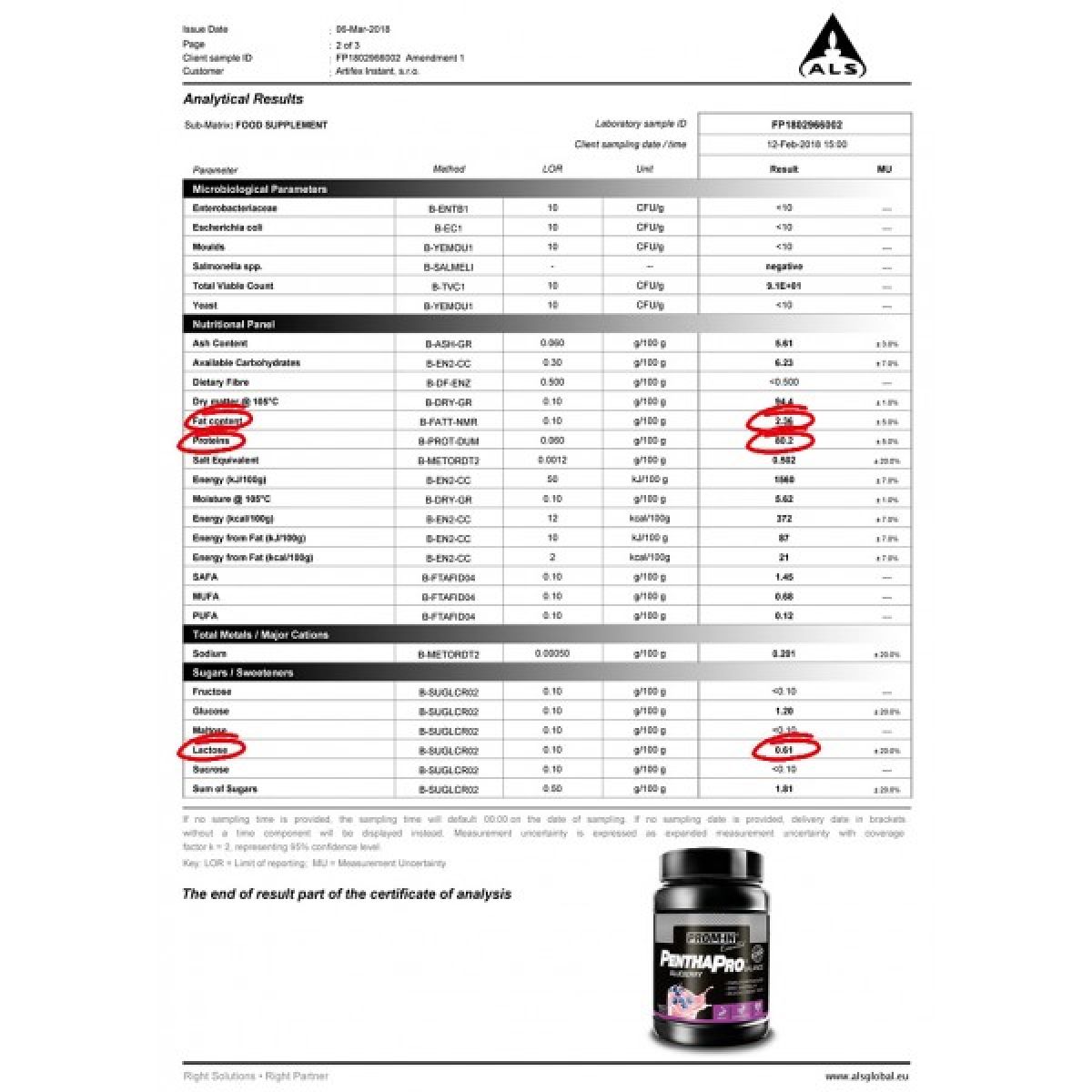 - směs bílkovin Pentha Pro [micelární kasein (mléko), syrovátkový proteinový koncentrát zpracovaný metodou CFM (mléko, emulgátor sójový lecitin), enzymatickou hydrolýzou upravený syrovátkový protein (mléko), sušený vaječný albumin, syrovátkový proteinový izolát zpracovaný metodou CFM (mléko, emulgátor sójový lecitin)], odtučněný kakaový prášek 8 % (emulgátor sójový lecitin), zahušťovadlo guarová guma, aroma, enzymy laktáza, bromelain, papain, sladidlo sukralóza