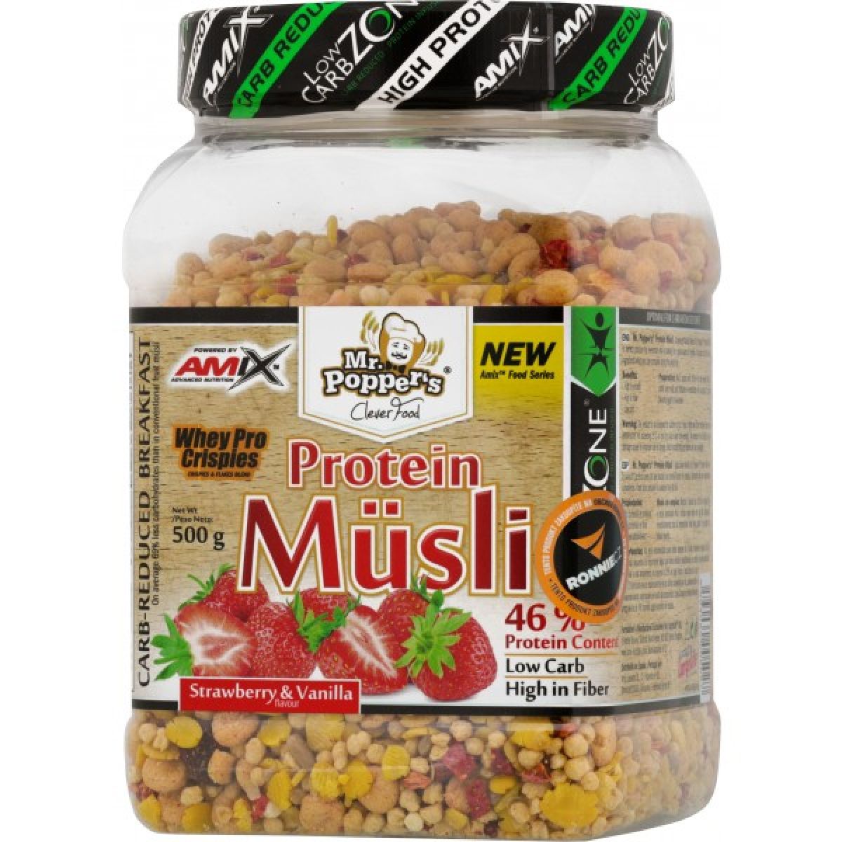 - směs WheyPro Crispies & Flakes 90 % [sójové vločky, sójové křupinky (sójový proteinový izolát, tapiokový škrob, chlorid sodný), vanilkové sójové vločky (sójový proteinový izolát, kukuřičná mouka, rýžová mouka, slunečnicový olej, moučkový cukr, aroma, chlorid sodný, antioxidant extrakt z rozmarýnu), syrovátkové křupinky (rýžová mouka, syrovátkový proteinový izolát, sójový lecitin)], slunečnicová semínka, lyofylizované jahodové kousky 3 %, rozinky 2 % (rozinky, rostlinný olej max. 0,5 %), konzervant oxid siřičitý (SO2)