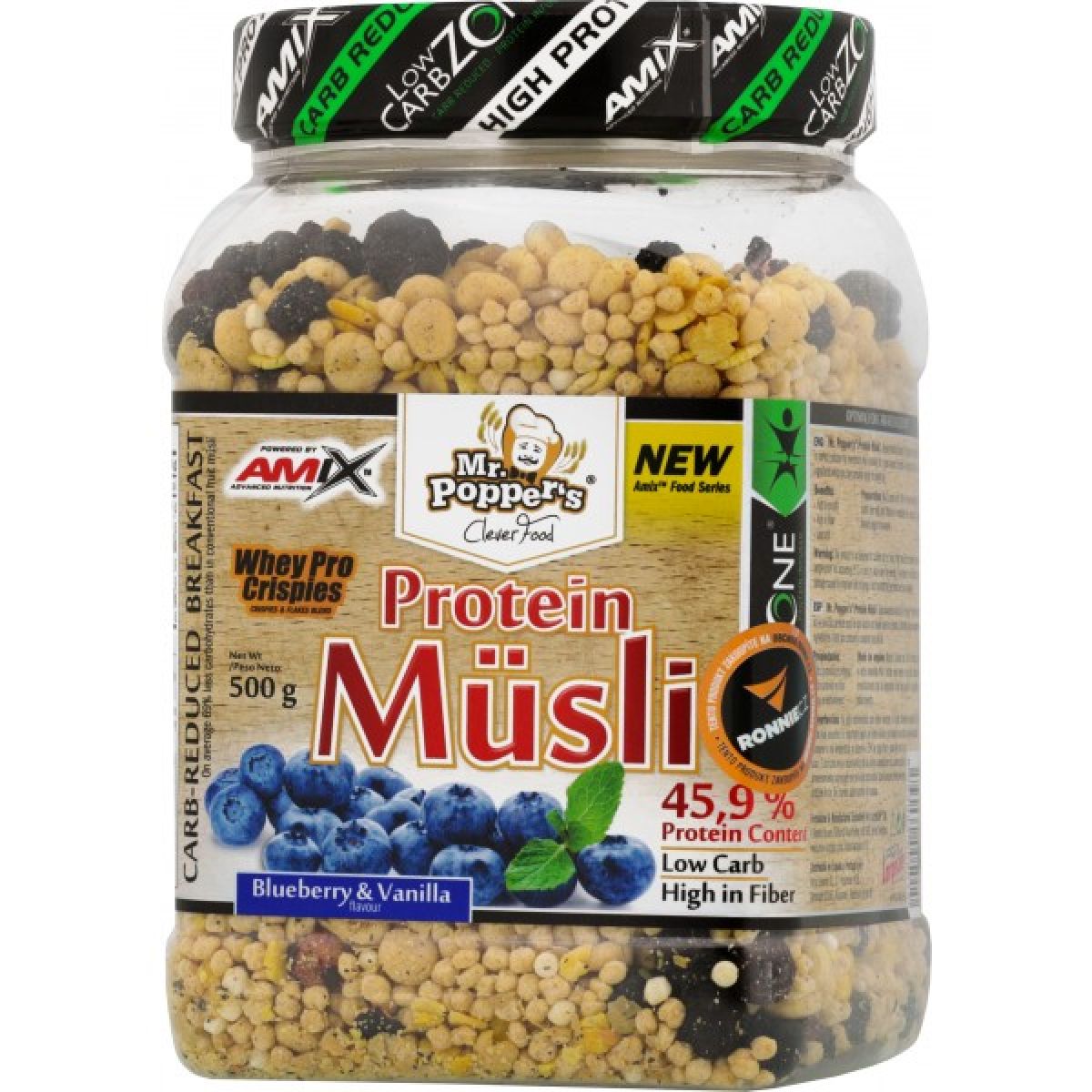 - směs WheyPro Crispies & Flakes 90 % [sójové vločky, sójové křupinky (sójový proteinový izolát, tapiokový škrob, chlorid sodný), vanilkové sójové vločky (sójový proteinový izolát, kukuřičná mouka, rýžová mouka, slunečnicový olej, moučkový cukr, aroma, chlorid sodný, antioxidant extrakt z rozmarýnu), syrovátkové křupinky (rýžová mouka, syrovátkový proteinový izolát, sójový lecitin)], slunečnicová semínka, lyofylizované borůvky 3 %, rozinky 2 % (rozinky, rostlinný olej max. 0,5 %), konzervant oxid siřičitý (SO2)