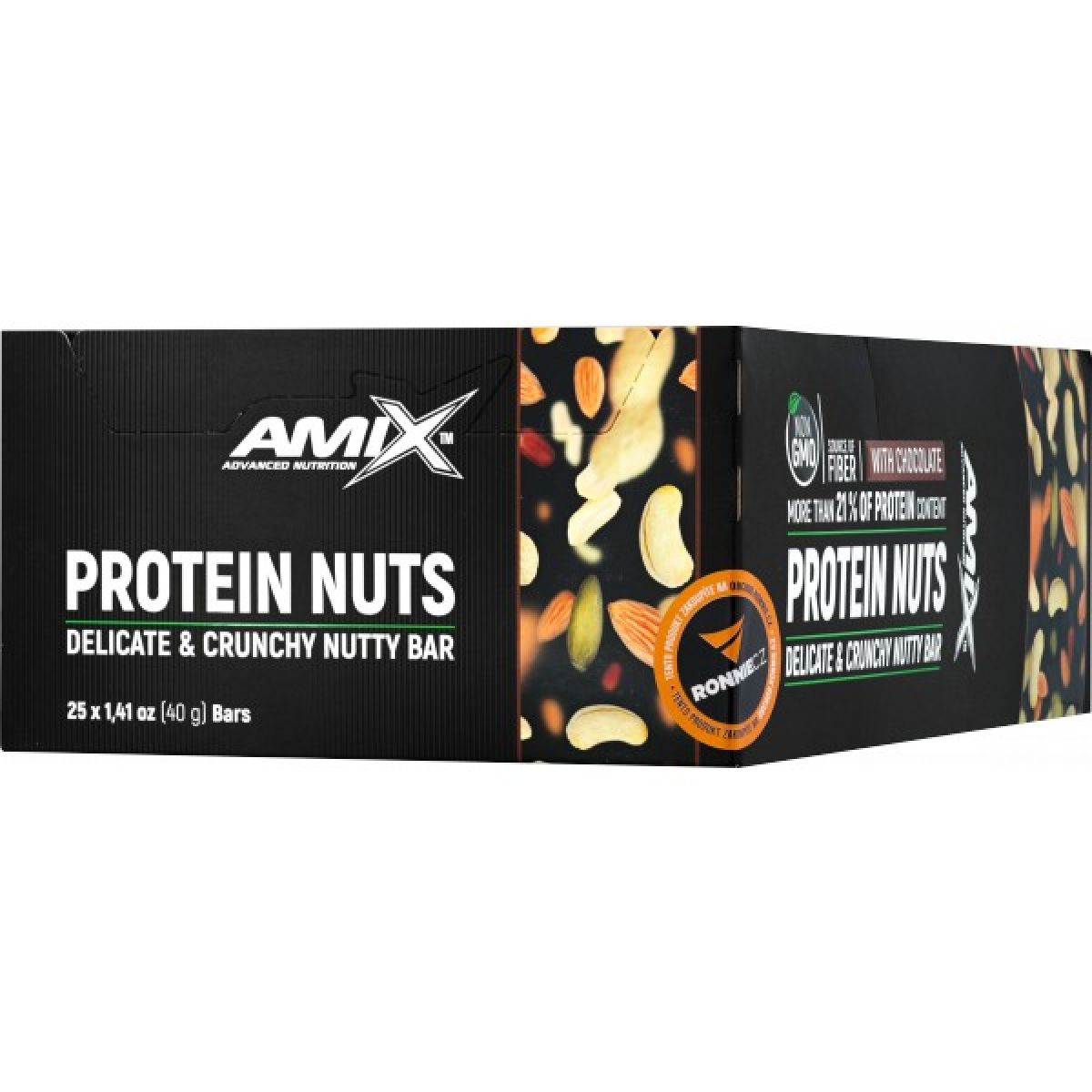 - arašídy 42 %, glukózový sirup, mléčná čokoláda 8 % (cukr, kakaové máslo, sušené plnotučné mléko, kakaová hmota, kakaový prášek, emulgátor sójový lecitin E 476, vanilkový extrakt, aroma), sójové křupky (sójový proteinový izolát, tapiokový škrob, chlorid sodný), tmavá čokoláda 6 % (cukr, kakaová hmota, kakaové máslo, kakaový prášek, emulgátor sójový lecitin E 476, vanilkový extrakt), mandle 5 %, polydextróza, kakaové sójové křupky (sójová bílkovina, rýžová krupice, cukr, kakaový prášek, sójová mouka, sůl, aroma), kandovaná pomerančová kůra 3 % (pomerančová kůra, glukózový sirup, cukr, regulátor kyselosti kyselina citronová, konzervant oxid siřičitý), rostlinný tuk (palmojádrový, palmový a bambucký olej v různém poměru), rozinky 2 % (rozinky, rostlinný tuk - max. 0,5 %, konzervant oxid siřičitý), sójové boby, zvlhčující látka glycerol, aroma, emulgátor sójový lecitin, chlorid sodný