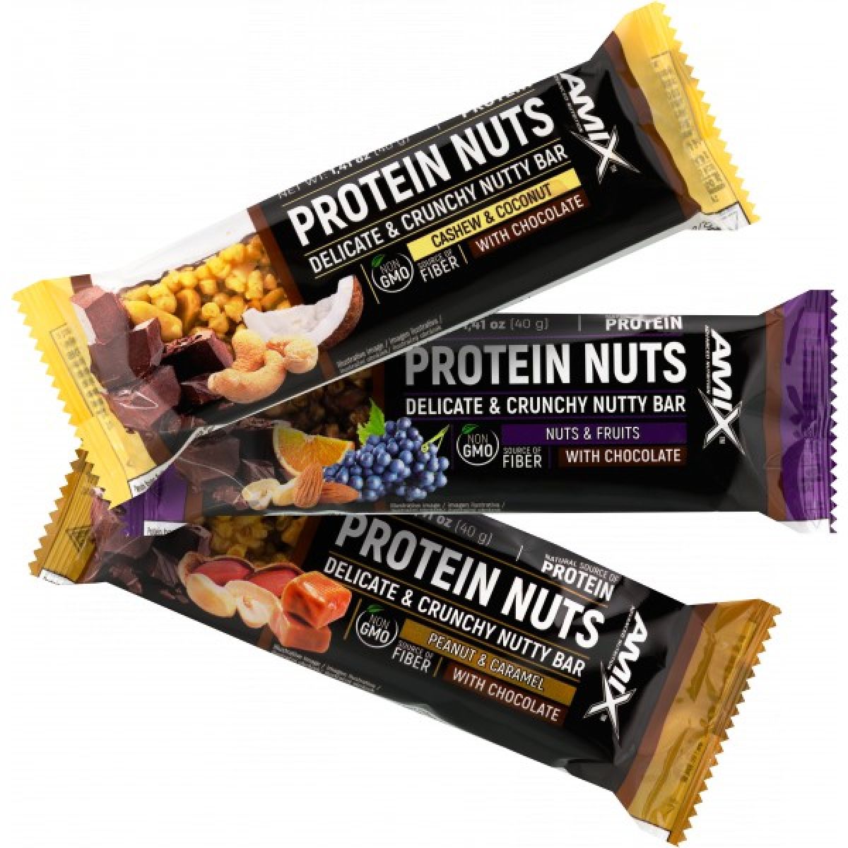 - arašídy 49,5 %, glukózový sirup, mléčná čokoláda 8 % (cukr, kakaové máslo, sušené plnotučné mléko, kakaová hmota, kakaový prášek, emulgátor sójový lecitin E 476, vanilkový extrakt, aroma), sójové křupky (sójový proteinový izolát, tapiokový škrob, chlorid sodný), polydextróza, sójové boby, rozinky (rozinky, rostlinný tuk - max. 0,5 %, konzervant oxid siřičitý), karamelové mléko 3 % (mléko, cukr), kakaové sójové křupky (sójová bílkovina, rýžová krupice, cukr, kakaový prášek, sójová mouka, sůl, aroma), rostlinný tuk (palmojádrový, palmový a bambucký olej v různém poměru), zvlhčující látka glycerol, aroma, emulgátor sójový lecitin, chlorid sodný