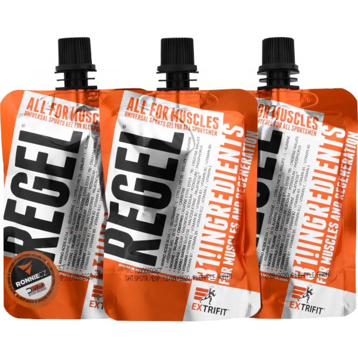 Lámali jste si někdy hlavu nad tím, jaké všechny látky a v jakém množství máte dávkovat pro urychlení regenerace po tréninku? Jaké přijímat sacharidy, jak dávkovat aminokyseliny nebo kolik užívat glutaminu a kreatinu pro odvrácení katabolismu po tréninku? Firma Extrifit vyslyšela tyto Vaše časté dotazy! Regel je dokonale sestaveným komplexem všech látek, které sportovec nutně potřebuje doplnit v průběhu a po skončení tréninku! Regel obsahuje pečlivě vyvážený poměr tří druhů sacharidů a volných aminokyselin, anabolizéry, dvě formy kreatinu a komplex vitamínů a minerálních látek. A to vše ve formě hotového gelu připraveného k okamžité konzumaci.