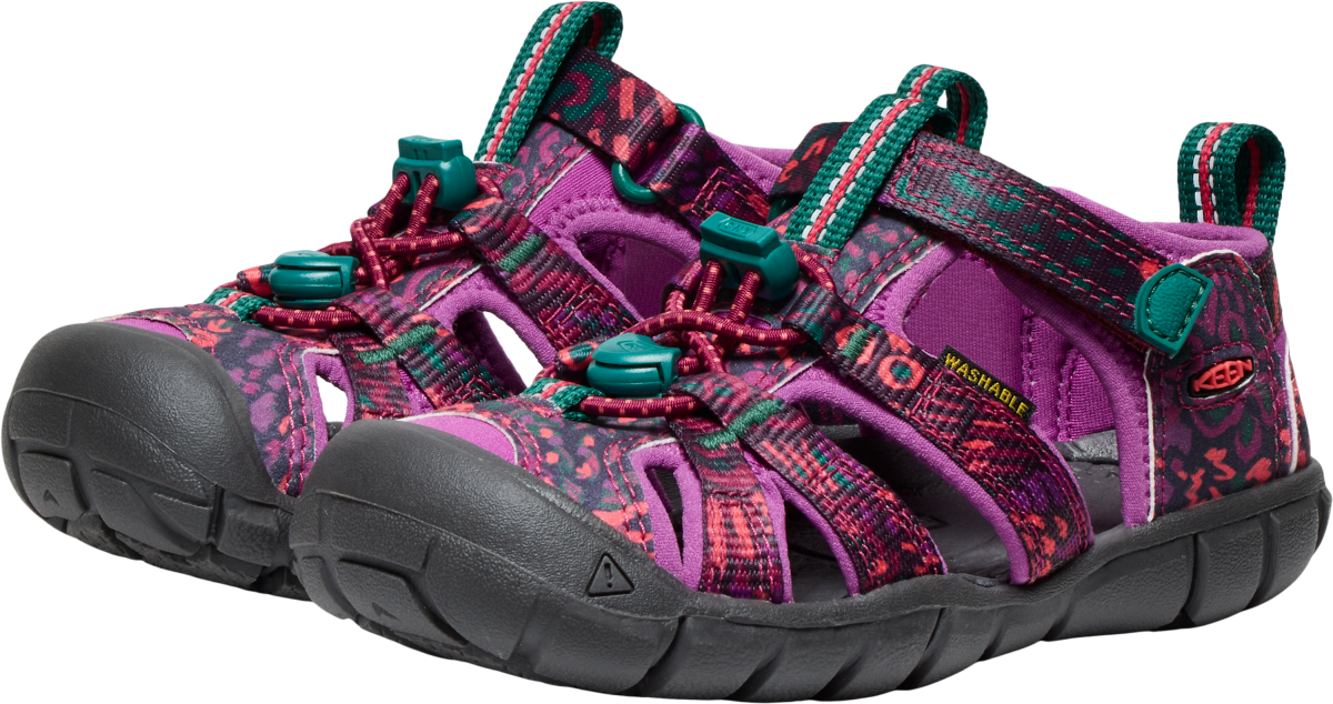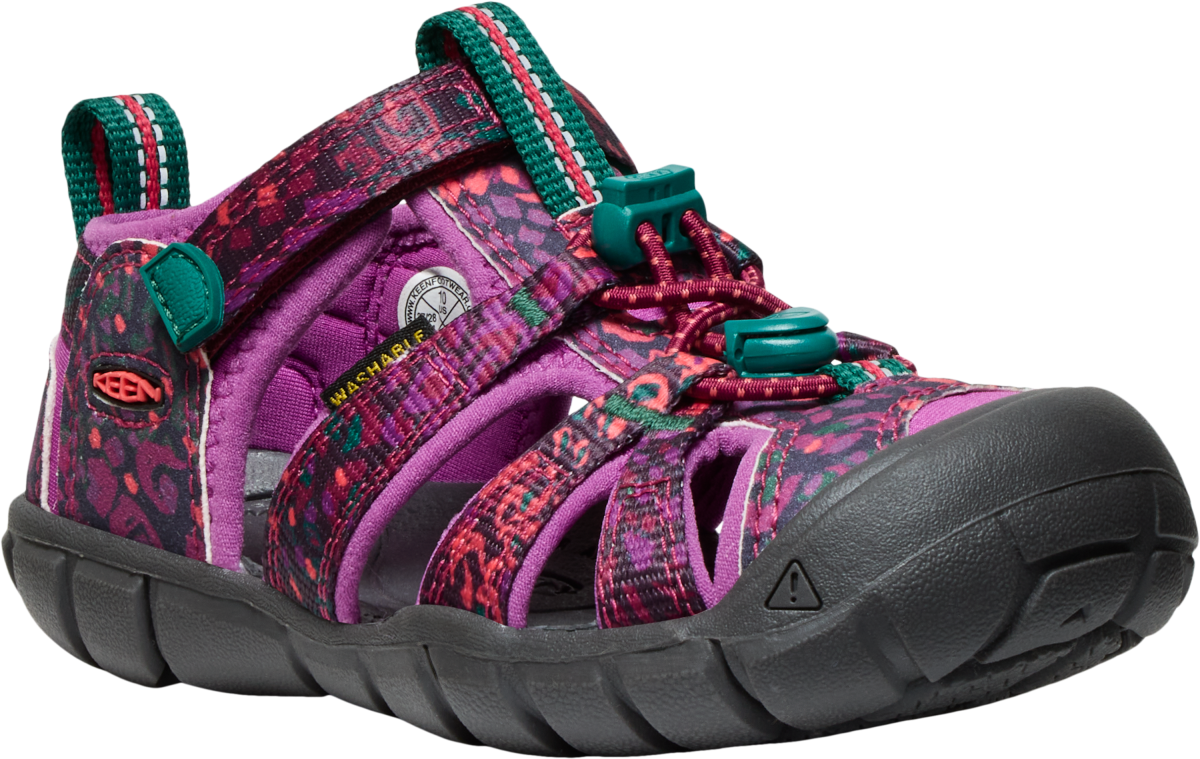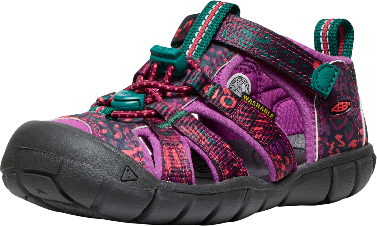 Skvělé a velmi populární dětské sandály Keen Seacamp II CNX pro všestranné využití jsou vyrobeny technologií KEEN.CNX. To znamená, že se jedná o nízkoprofilovou univerzální letní botu inspirovanou minimalistickým stylem obouvání. Nízký profil boty umožňuje přirozený pohyb nohy v maximálním rozsahu, zároveň však poskytuje chodidlu dostatečnou míru bezpečí, včetně patentované ochrany prstů. Model vyniká především nízkou hmotností. Svršek je z pevné polyesterové popruhoviny doplněné o rychleschnoucí podšívku. Anatomicky tvarovaná stélka z materiálu EVA zajišťuje podporu klenby chodidla a pohodlí při celodenním nošení. Kvalitní gumová podešev s vícesměrným vzorkem dobře přilne i k mokrému povrchu. Rychlozavazovací systém umožňuje snadné nazutí a rychlé upevnění na noze, které navíc ještě doplňuje pásek přes nárt se zapínáním na suchý zip. Boty jsou ošetřeny přírodní antibakteriální technologií ECO ODOR CONTROL proti zápachu a dají se prát v automatické pračce.