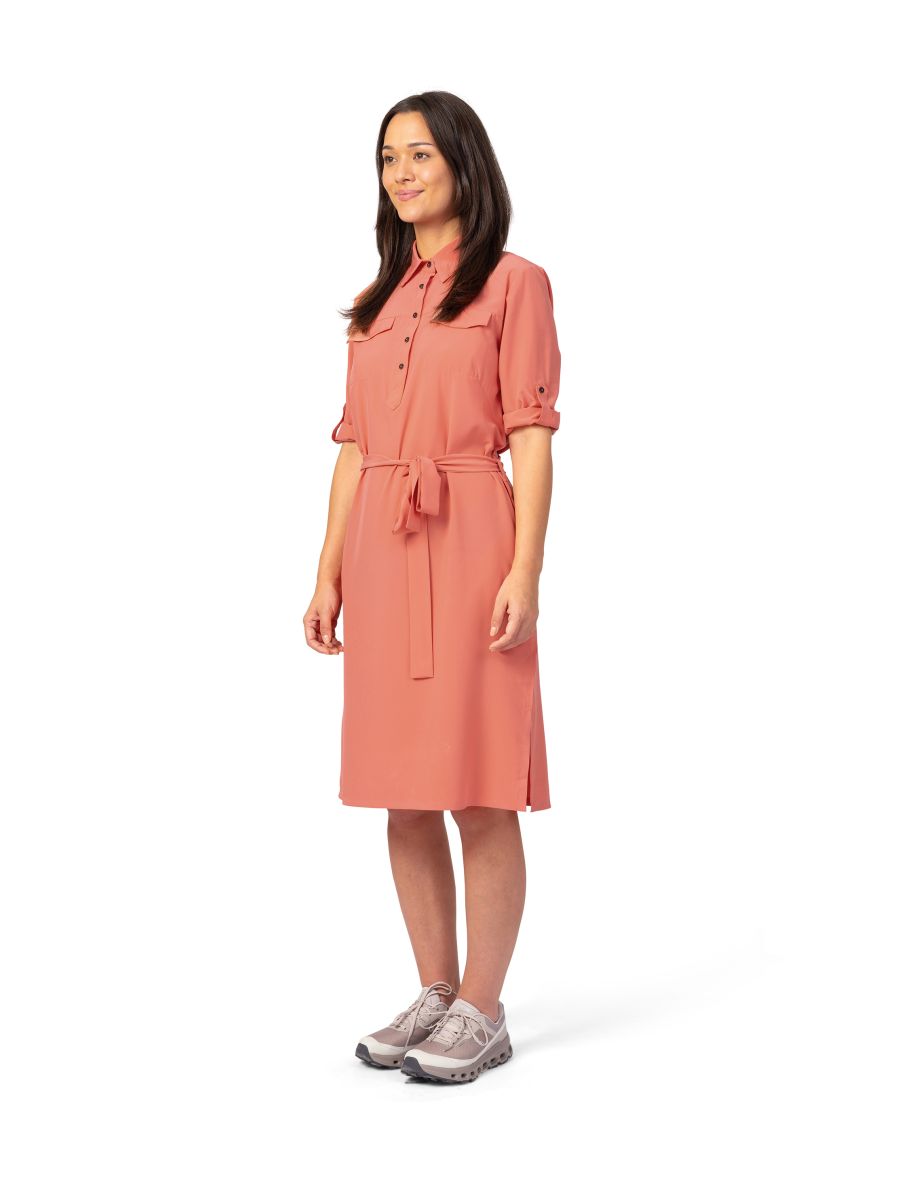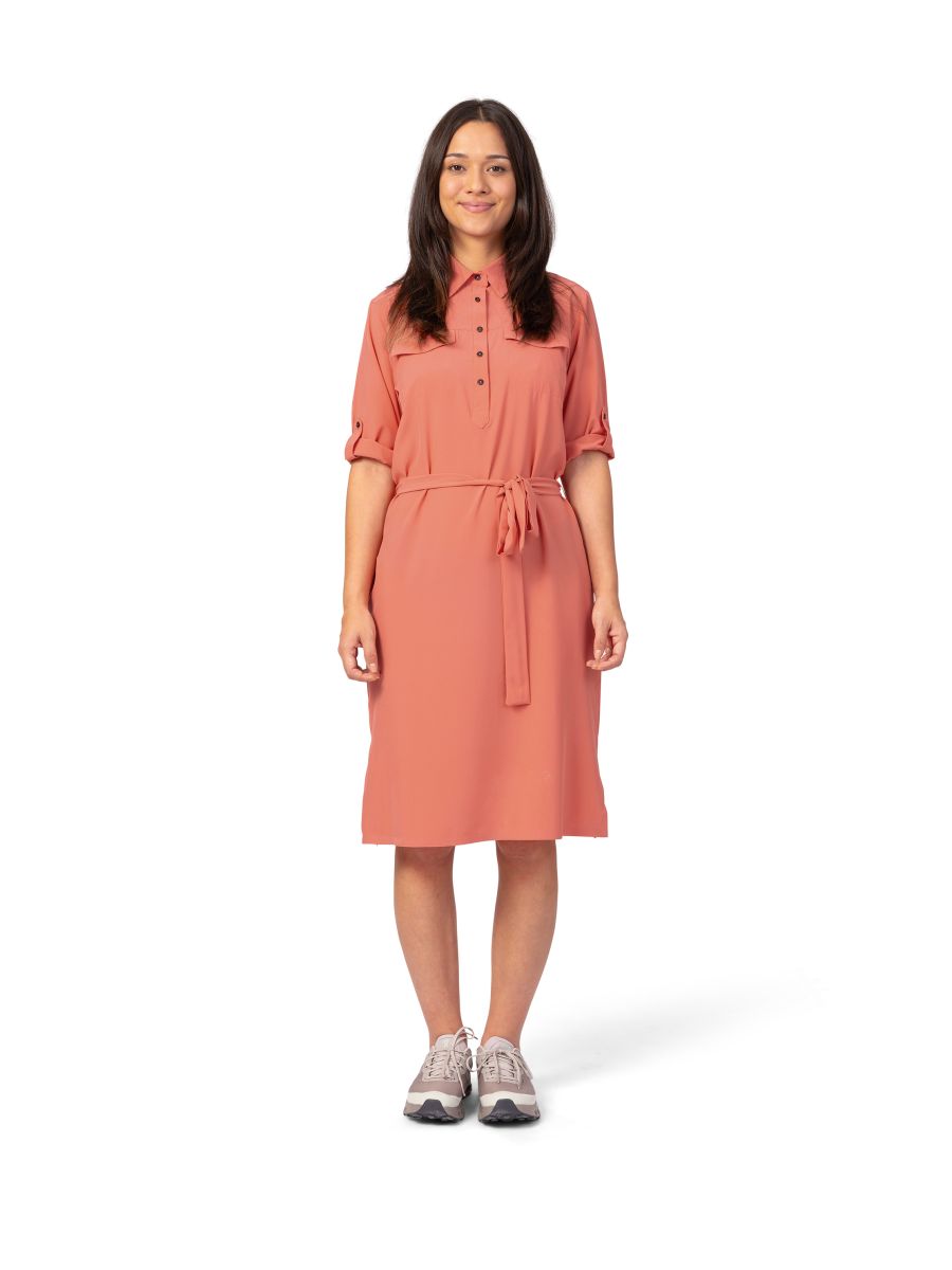 Dámské lehoučké šaty s delším rukávem jsou vyrobeny z funkčního a vysoce elastického a prodyšného materiálu AFT Stretch. Neuvěřitelně lehký, jemný a příjemný funkční elastický materiál oceníte během horkých letních dní. Elegantní košilový delší střih nad kolena s páskem v pase.Rukávy lze nosit v delším provedení či ohrnout na kratší délku a zapnout na knoflíček. Lepený dolní kraj i lem rukávů dodává šatům čistý vzhled. Jednobarevné provedení a elegantní styl v kombinaci s funkčností a pohodlím oceníte pro běžné nošení, cestování a volný čas.