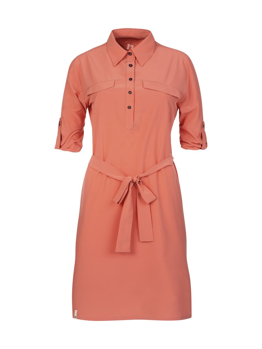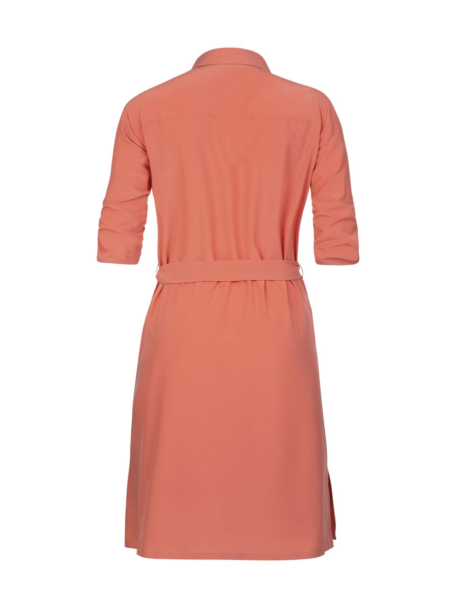 Dámské lehoučké šaty s delším rukávem jsou vyrobeny z funkčního a vysoce elastického a prodyšného materiálu AFT Stretch. Neuvěřitelně lehký, jemný a příjemný funkční elastický materiál oceníte během horkých letních dní. Elegantní košilový delší střih nad kolena s páskem v pase.Rukávy lze nosit v delším provedení či ohrnout na kratší délku a zapnout na knoflíček. Lepený dolní kraj i lem rukávů dodává šatům čistý vzhled. Jednobarevné provedení a elegantní styl v kombinaci s funkčností a pohodlím oceníte pro běžné nošení, cestování a volný čas.