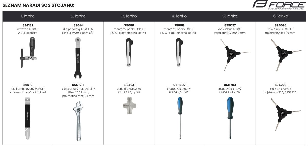 obsahuje nářadí pro servisní práce, hustilku s manometrem, držák pro umístnění jízdního kola, instrukce s vysvětlením oprav