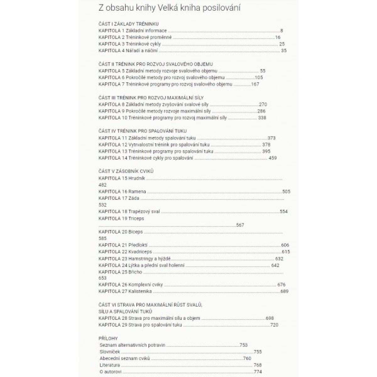 Tato komplexní encyklopedie detailně popisuje všechny hlavní aspekty silového tréninku a nabízí pro ně speciálně připravené programy, ať již je jejich cílem nárůst svalové hmoty, rozvoj síly, nebo úbytek tuku. Přináší bohatý výběr tréninků, metod a cviků a nabízí konkrétní příklady tréninkových jednotek, které jsou doplněné informací o obtížnosti, účinnosti a rychlosti, s jakou lze dosáhnout požadovaného cíle.
