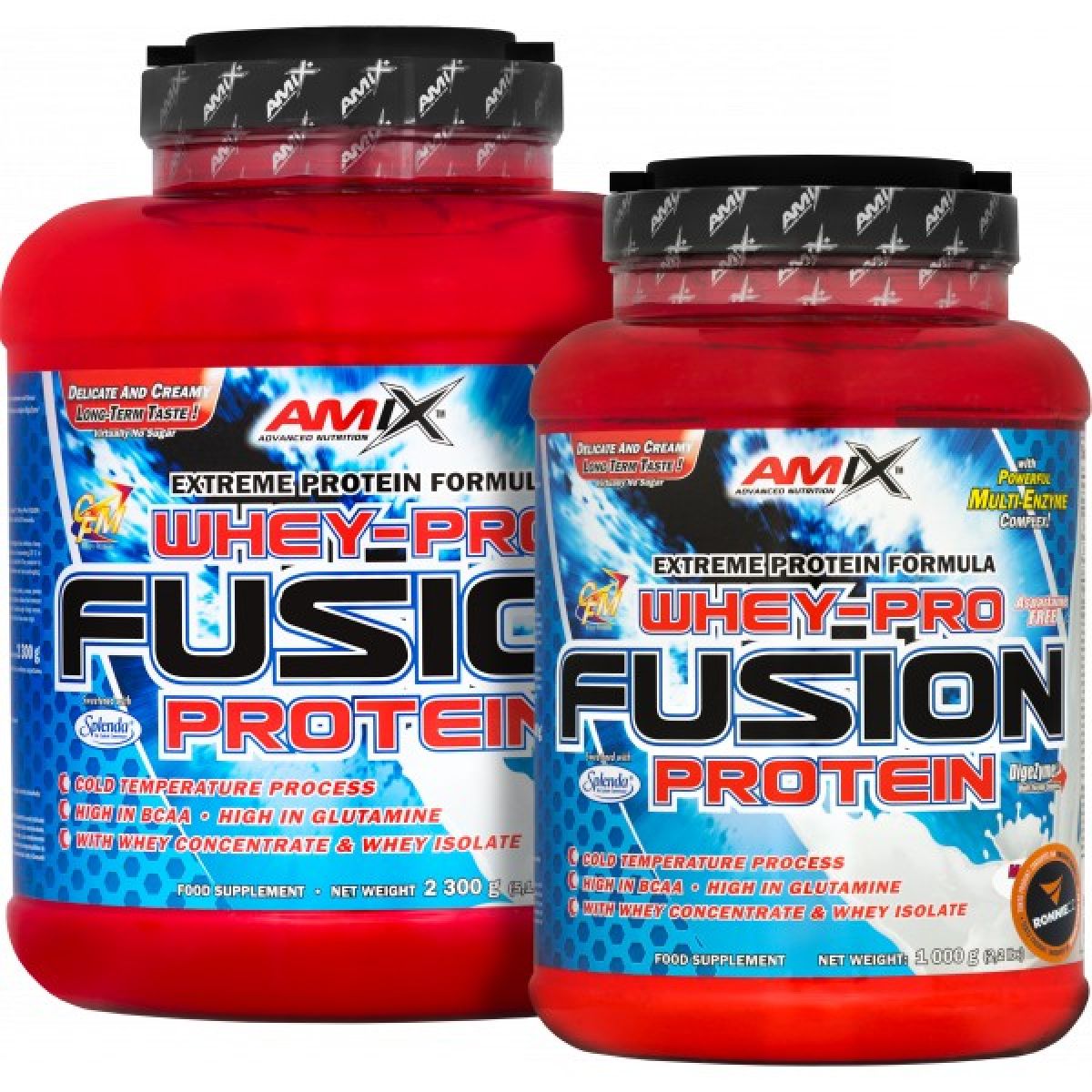 - Whey-Pro Fusion 1:1 proteinový komplex 80 % [syrovátkový proteinový koncentrát vyrobený ultrafiltrací za studena, CFM syrovátkový proteinový izolát s bílkovinnými frakcemi (beta-laktoglobulin, alfa-laktoglobulin, sérový albumin, imunoglobulin, glykomakropeptid, laktoferin, laktoperoxidáza)], stabilizátor hydrolyzát kolagenu, maltodextrin, kakaový prášek (pro příchuť čokoláda, čoko-kokos, arašídy-čoko-karamel, moca-čoko-káva), regulátor kyselosti kyselina citronová (pro příchuť modrá malina, mango-ananas, limeta-jogurt), emulgátor sójový lecitin, aroma, stabilizátor karboxymethylcelulóza sodná, sladidla sukralóza (Splenda®) a acesulfam K, barvivo kurkumin (pro příchuť banán, piňakoláda), barvivo měďnaté komplexy chlorofylu (pro příchuť pistácie, meloun-jogurt, jablko-skořice), barvivo ovocný extrakt - anthokyanin a brilantní modř FCF (pro příchuť modrá malina), barvivo beta karoten (pro příchuť mango-ananas, limeta-jogurt), extrakt z červené řepy (pro příchuť jahoda, lesní plody, piňakoláda), multienzymový komplex DigeZyme® (amyláza, lipáza, laktáza, celuláza, bakteriální neutrální proteáza), kakaový prášek (pro příchuť cookies, bílá čokoláda), sůl
