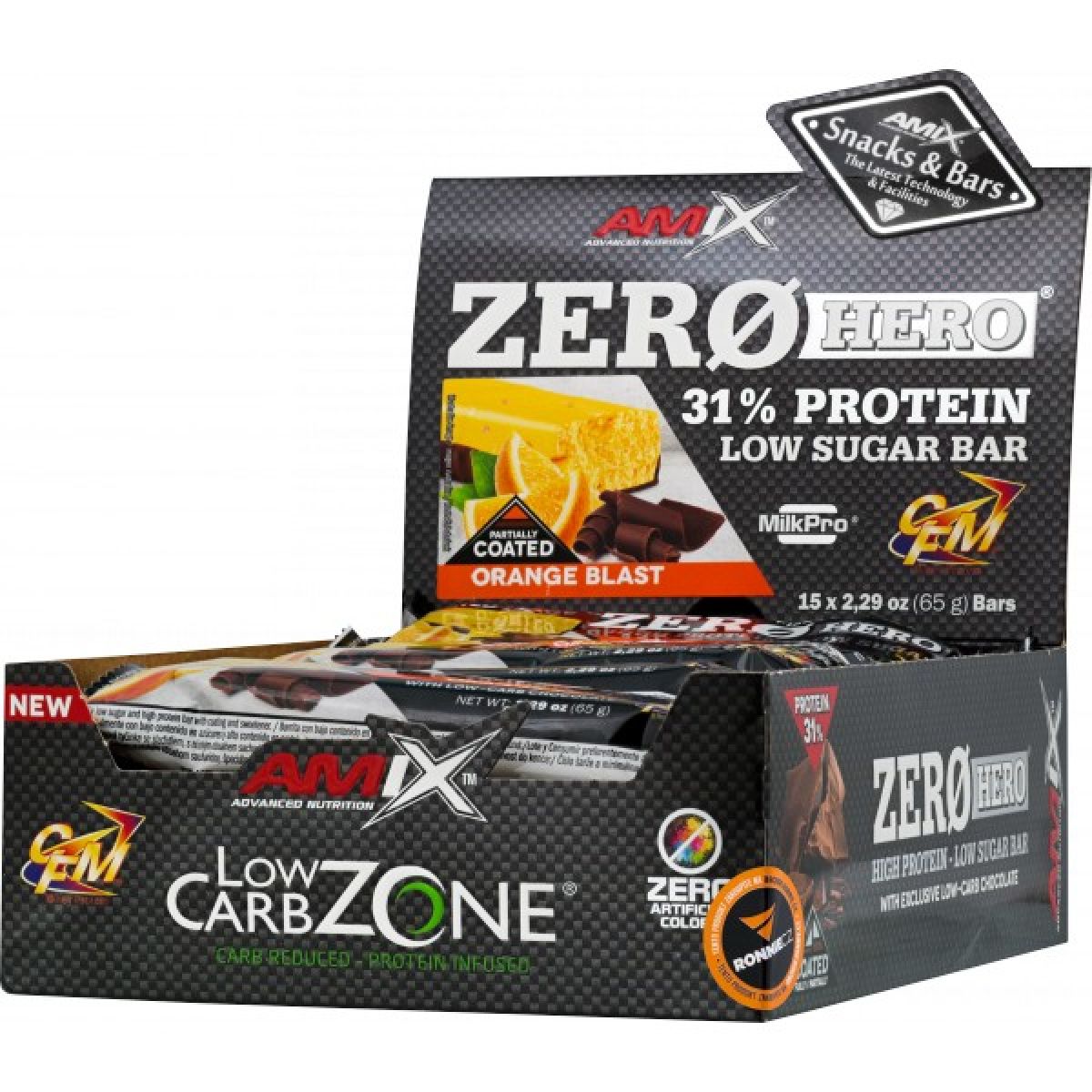 - Amix™ MilkPro® Protein Blend 36,8 % (mléčný bílkovinný izolát a koncentrát, CFM® syrovátkový bílkovinný izolát a koncentrát), zvlhčovadlo glycerol, maltitolový sirup, rostlinný tuk (palmojádrový, palmový a bambucký olej v různých poměrech), tmavá čokoláda se sladidlem (sladidlo maltitol, kakaová hmota, kakaové máslo, kakaový prášek, emulgátory sójový lecitin a E476), plnidlo polydextróza, kandovaná pomerančová kůra 2,2 % (pomerančová kůra, glukózový sirup, cukr, regulátor kyselosti kyselina citronová, konzervant oxid siřičitý SO2), regulátor kyselosti kyselina citronová, emulgátor sójový lecitin, aroma, barviva beta karoten a extrakt z červené řepy, sladidlo sukralóza